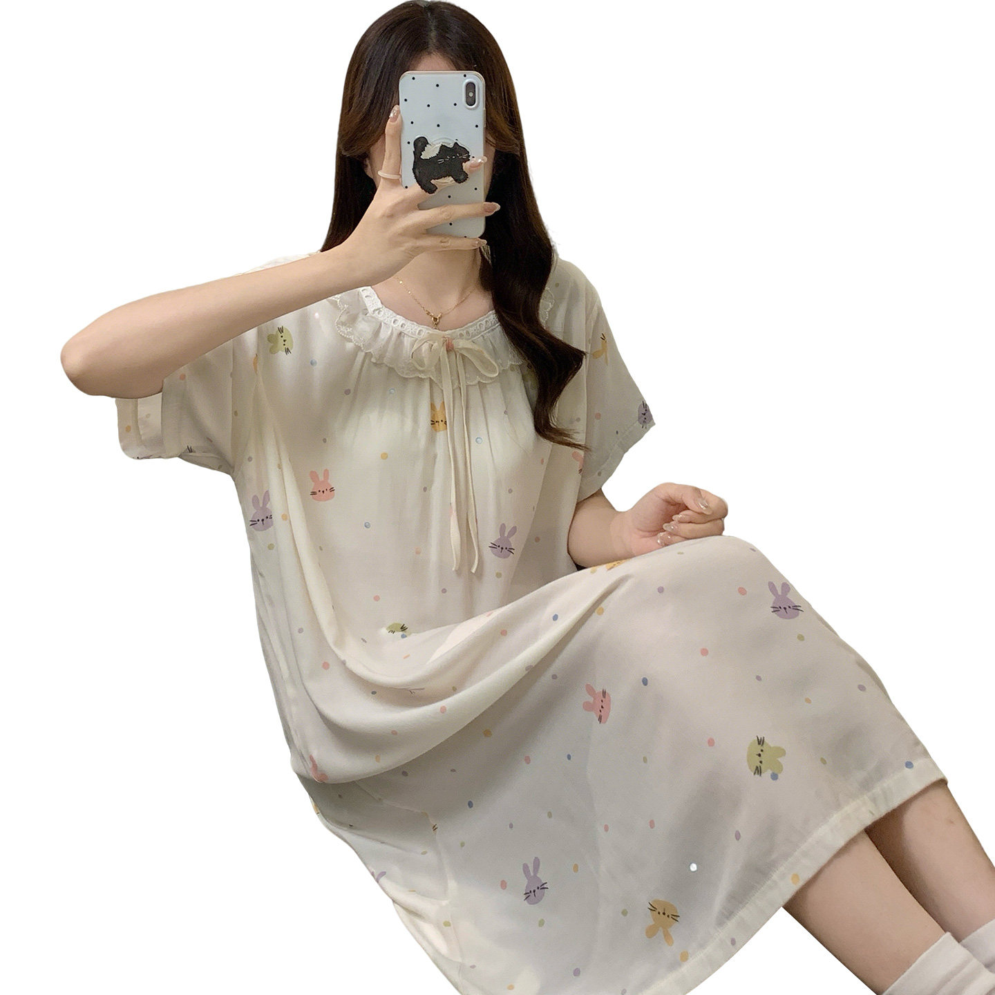 夏季甜美卡通兔子睡裙女云朵棉带胸垫一体高颜值连衣裙棉绸家居服