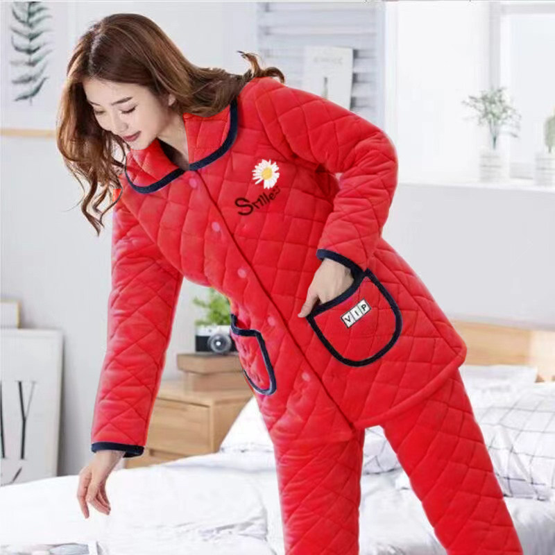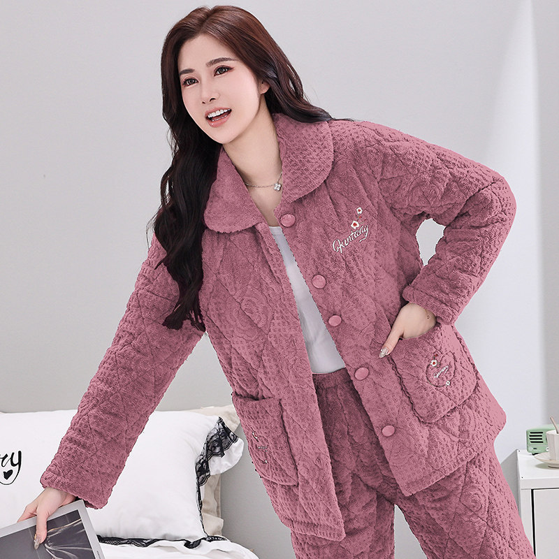 女士中年三层夹棉袄秋冬季睡衣加厚加绒珊瑚绒保暖妈妈家居服套装