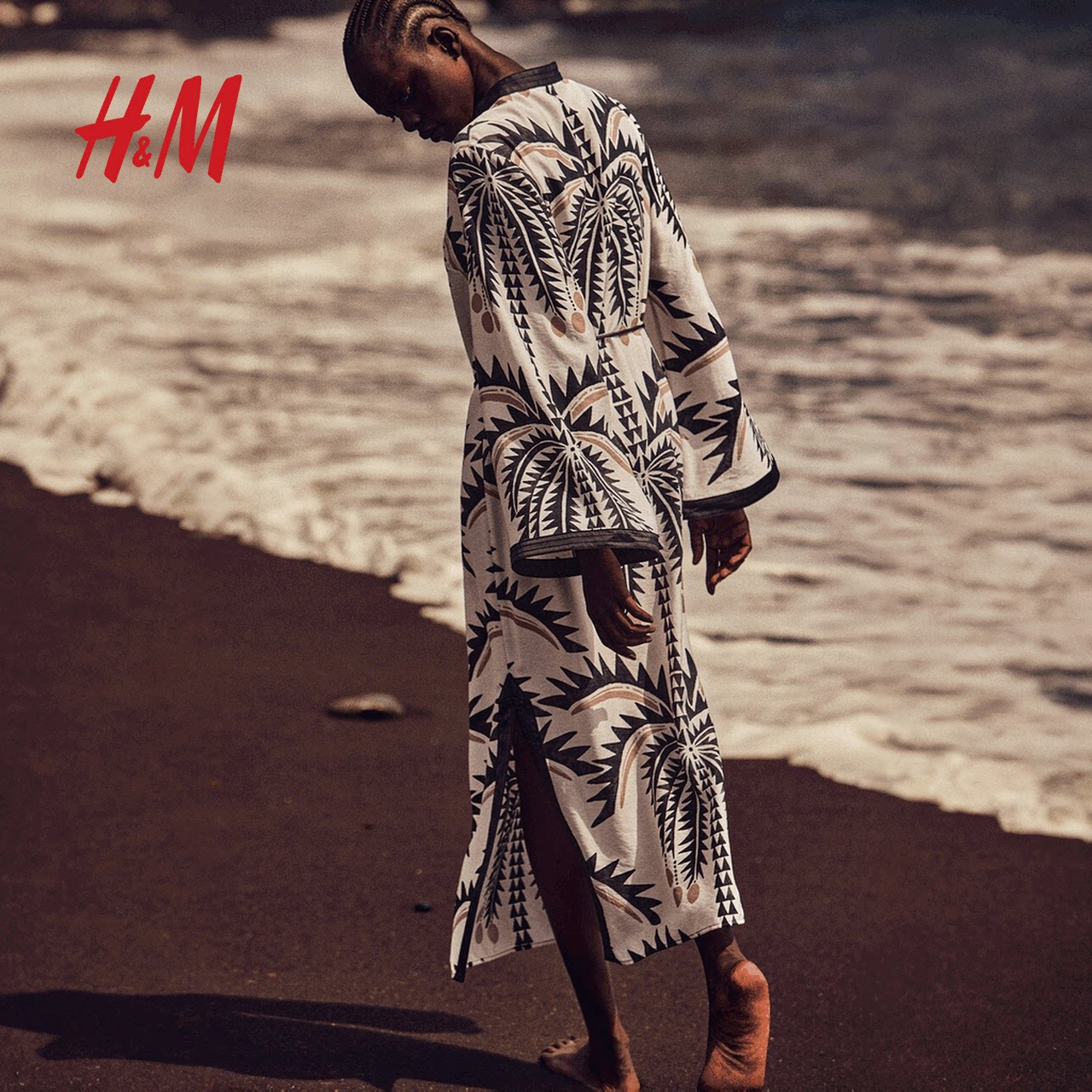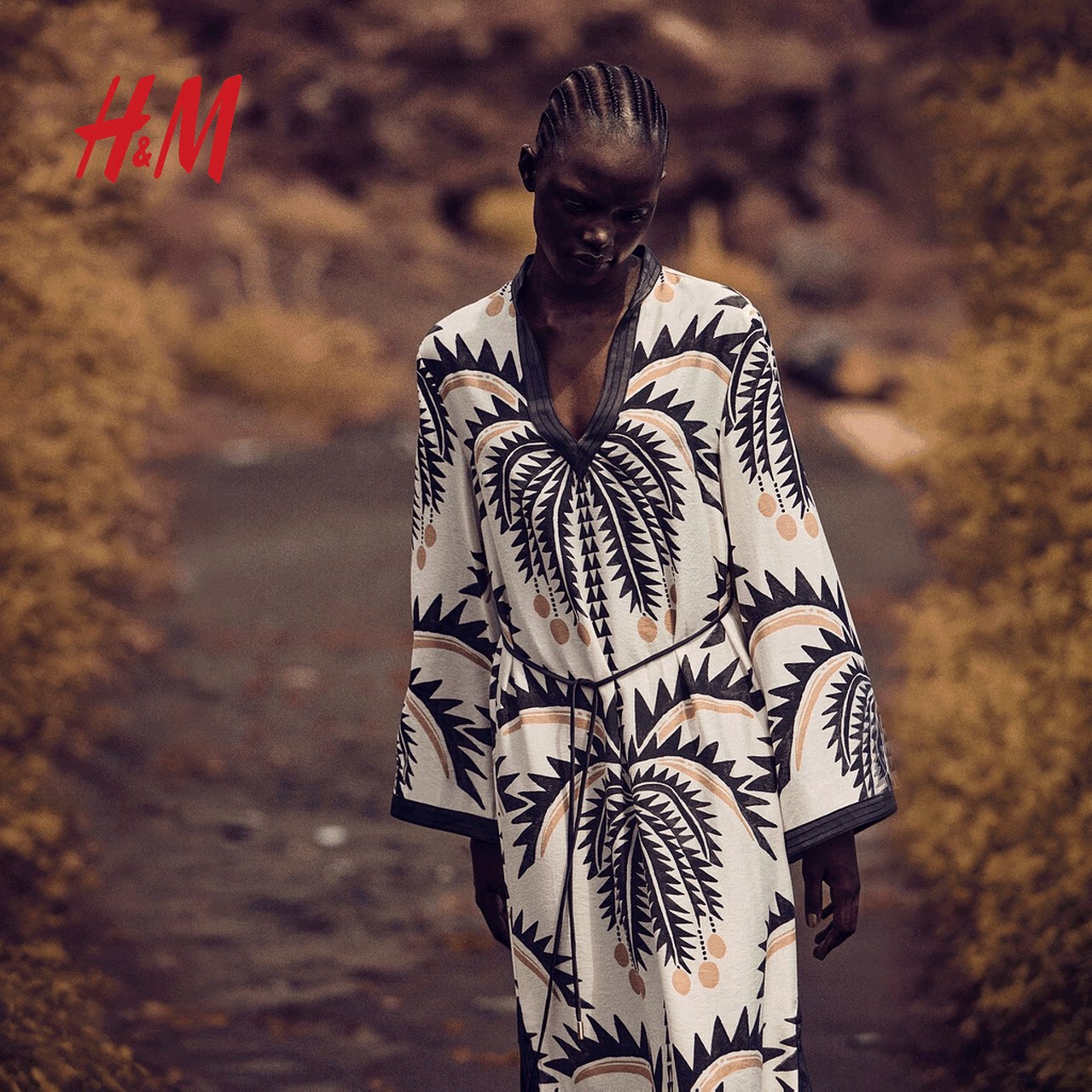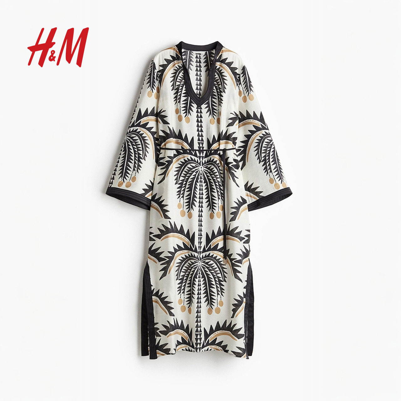 HM女装连衣裙春季腰部系带裙衫式植物印花长裙1289486
