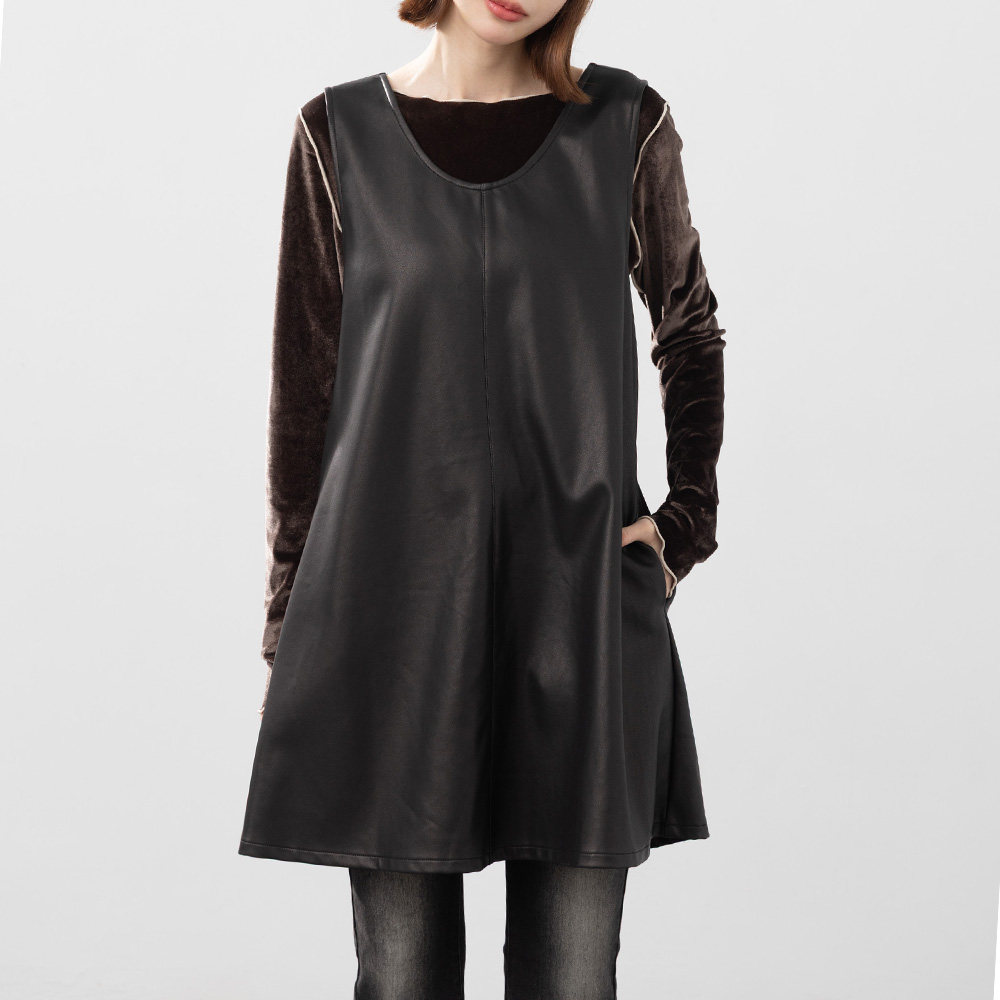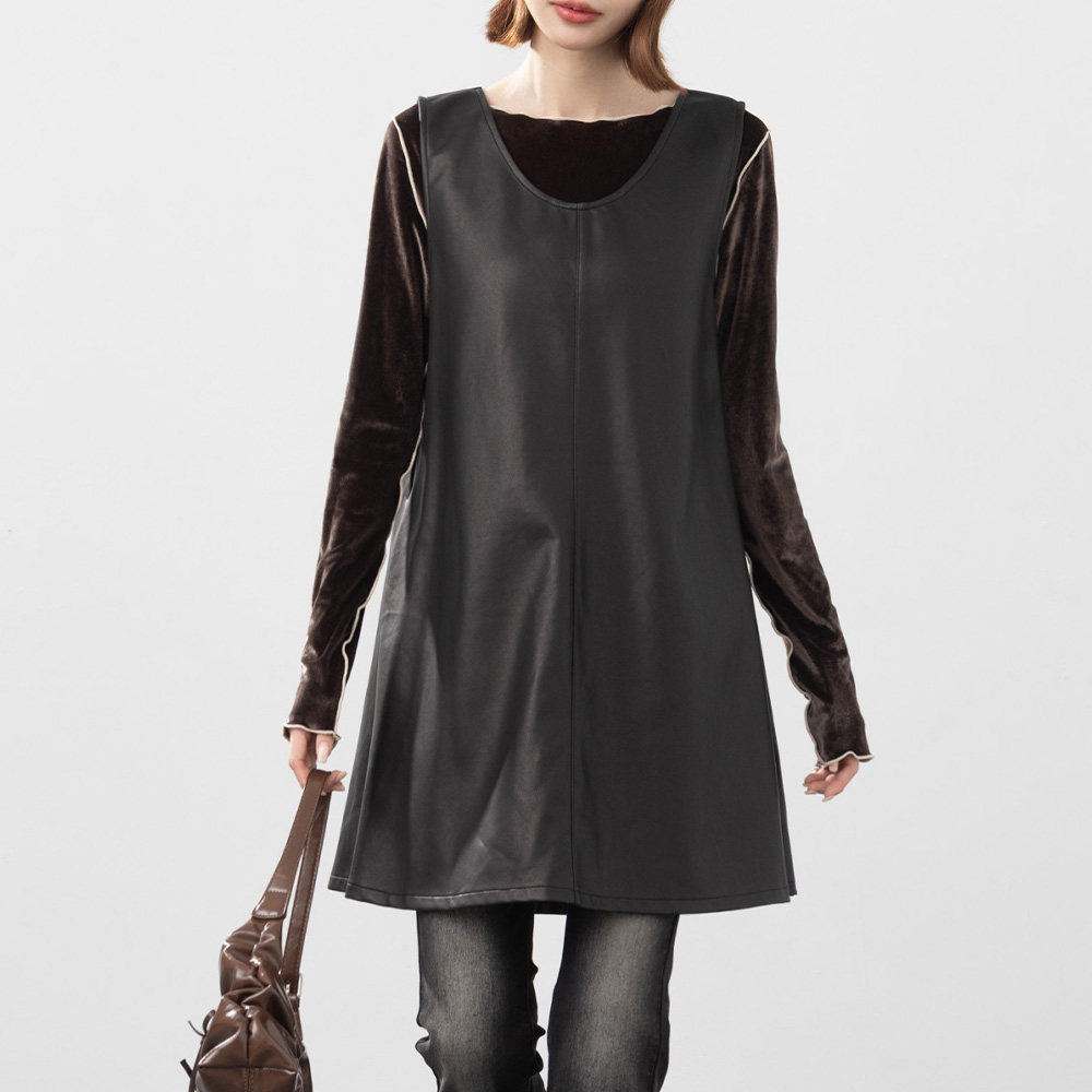QUEENSHOP 2025秋冬新品女装质感U领抓皱皮革短连衣裙01087169