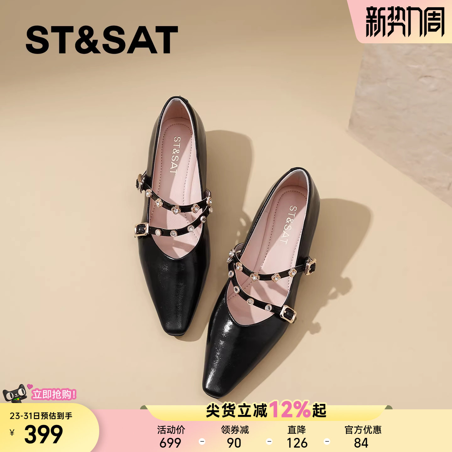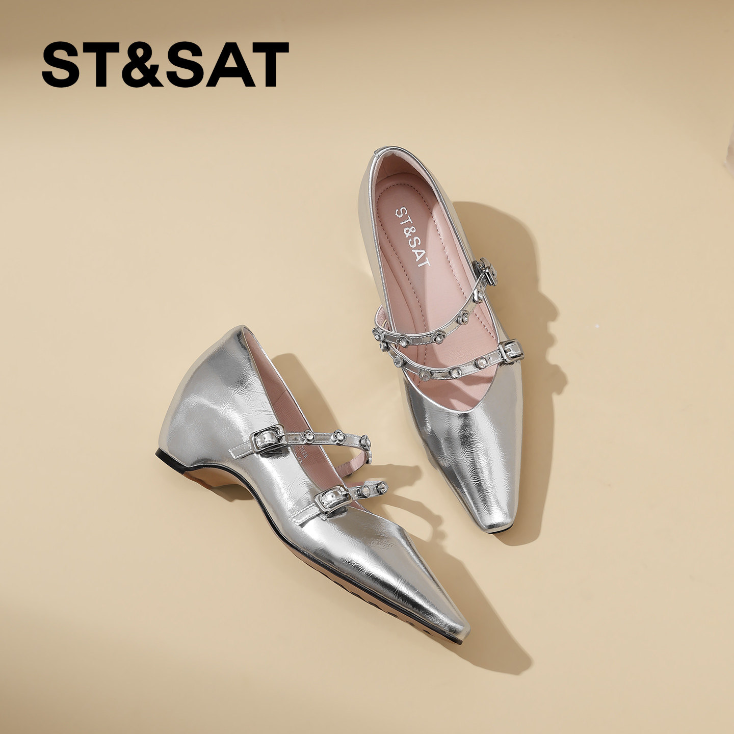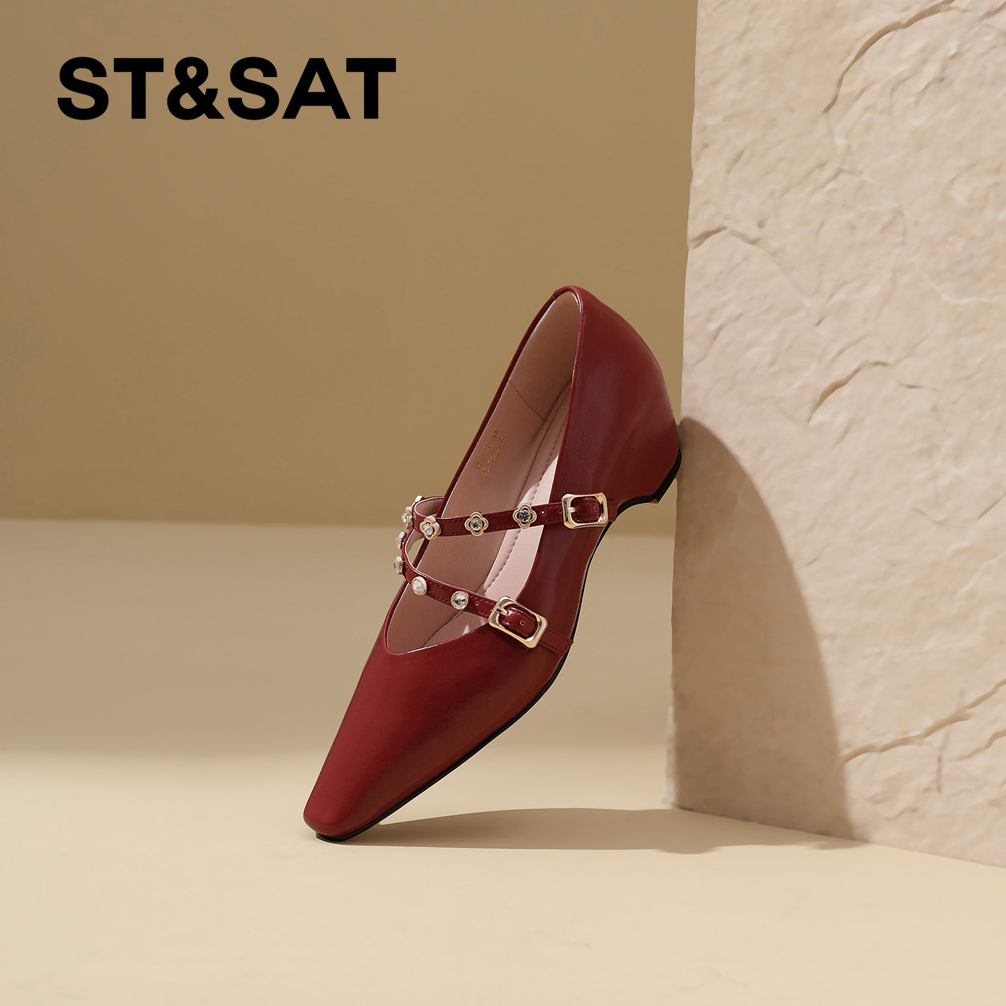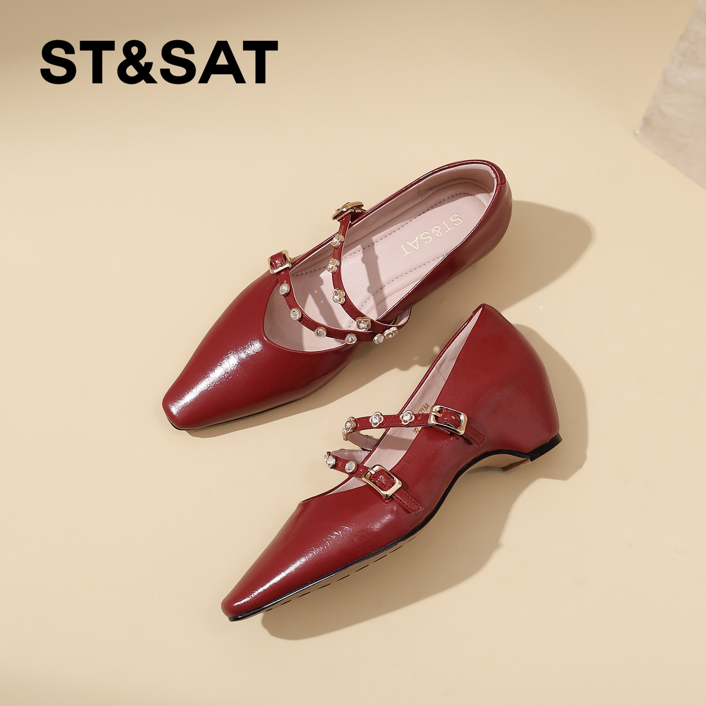 星期六真皮水钻玛丽珍鞋女2026年春季新款方头坡跟内增高浅口单鞋