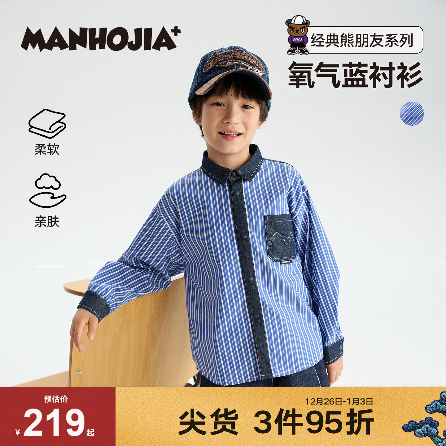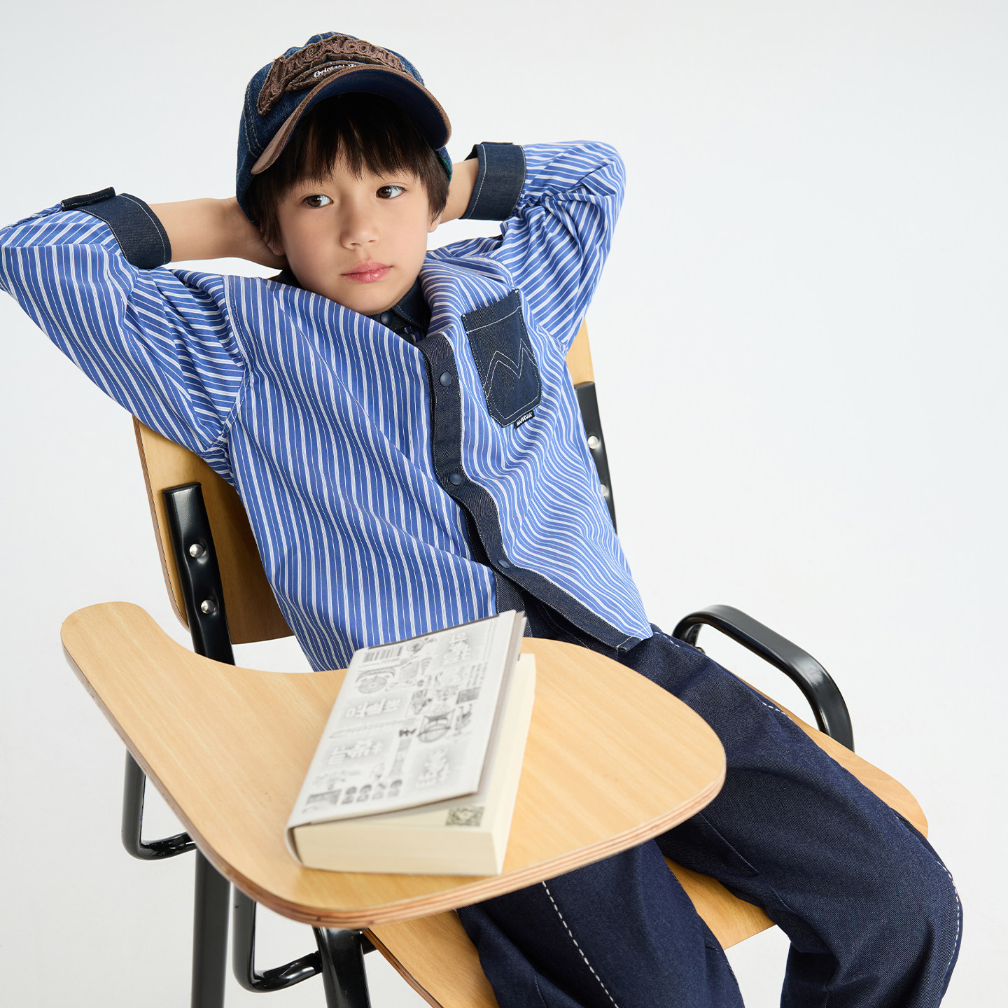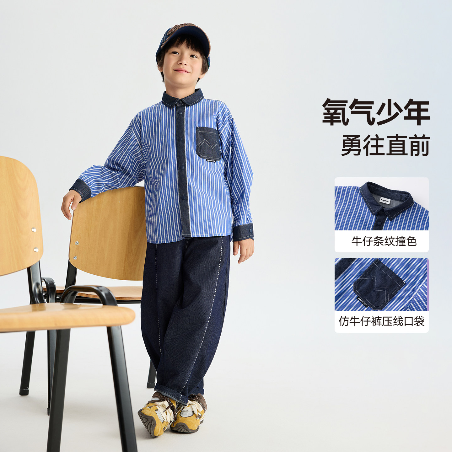 漫画家【氧气蓝衬衫】日系经典牛仔拼接条纹氧气少年感儿童衬衫