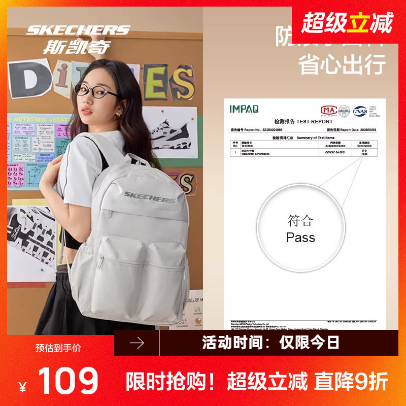 斯凯奇新品双肩包背包防泼水大容量口袋书包旅游通勤轻便登山包