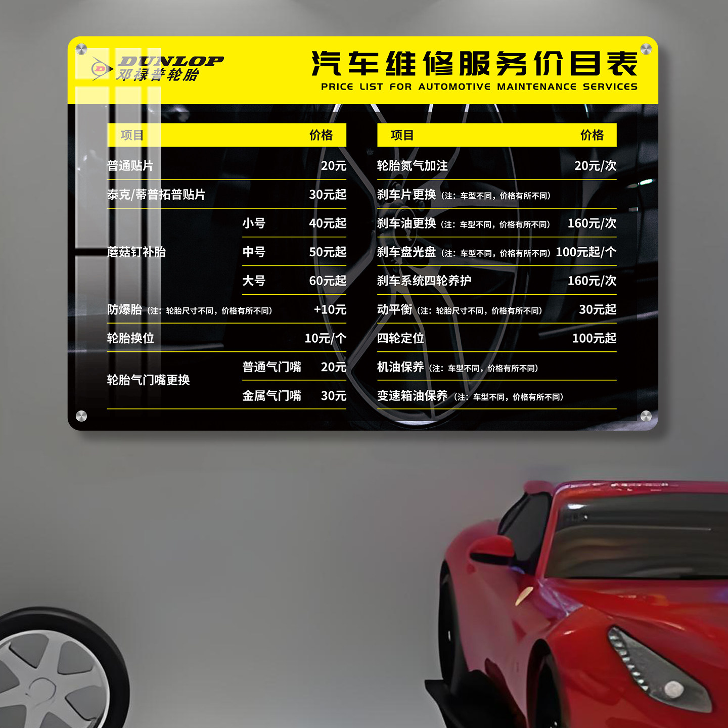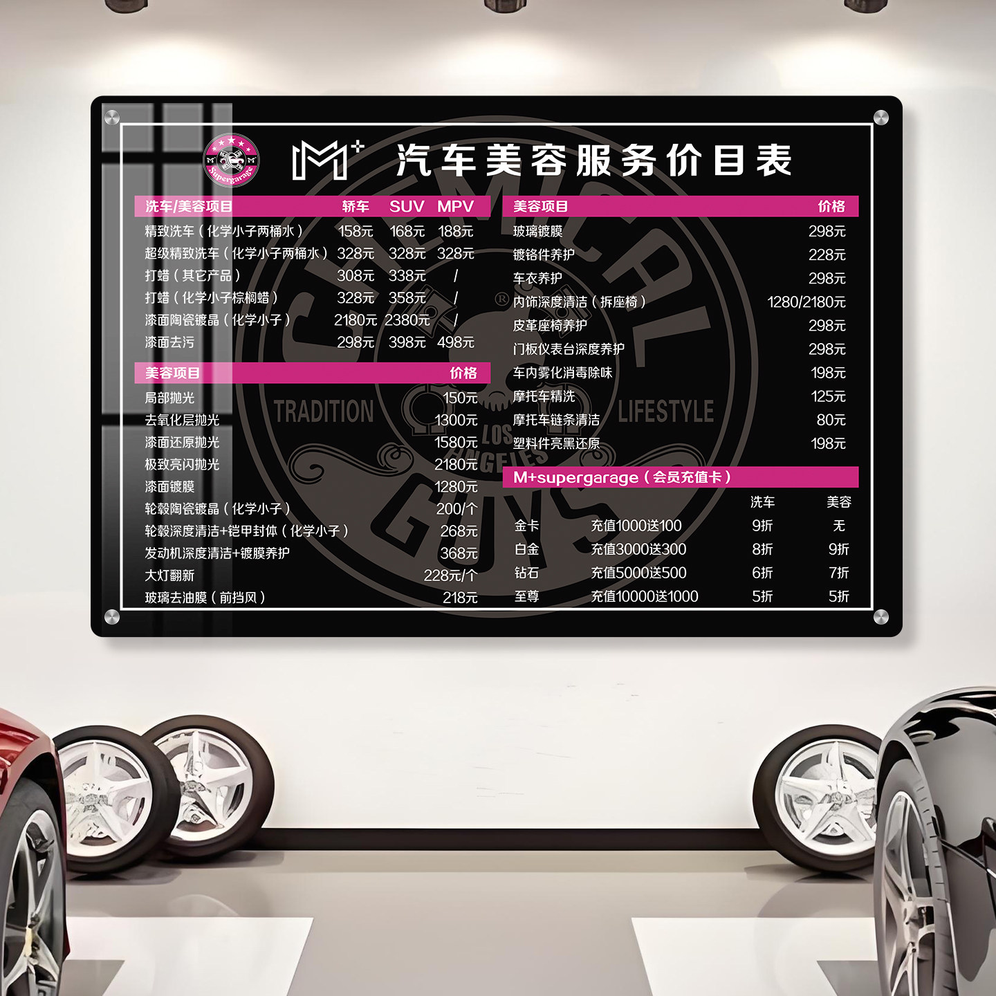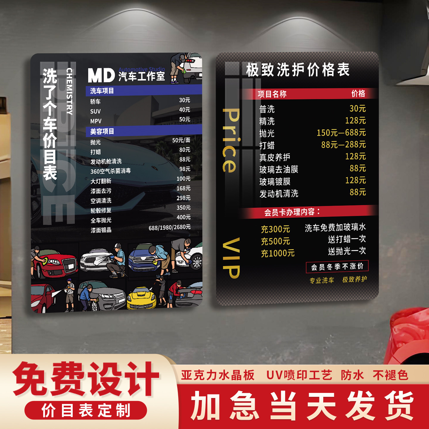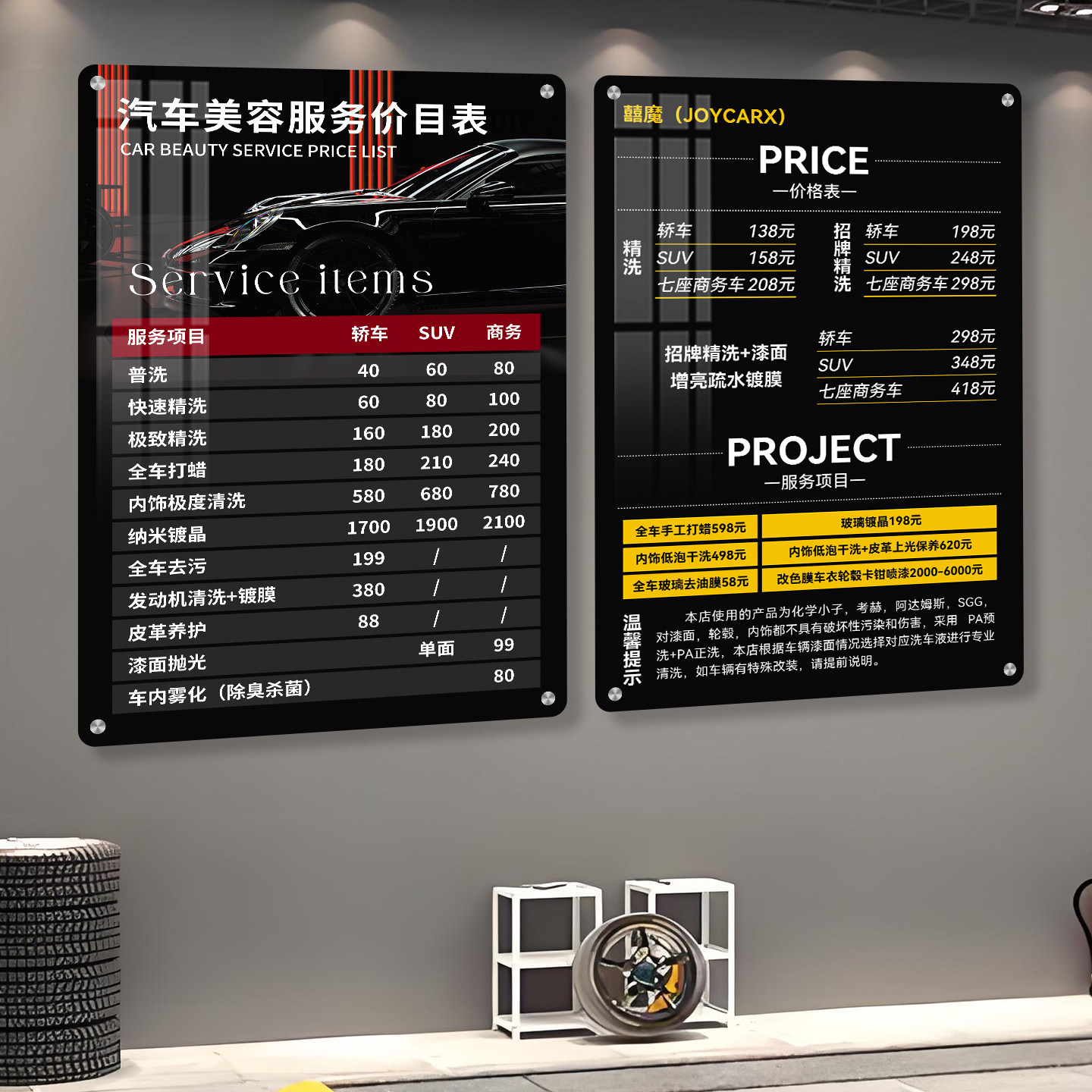洗车店汽车美容保养维修项目价格表亚克力展示牌挂墙防水贴墙挂牌定制展示台卡台牌服务价格定制台牌标识牌