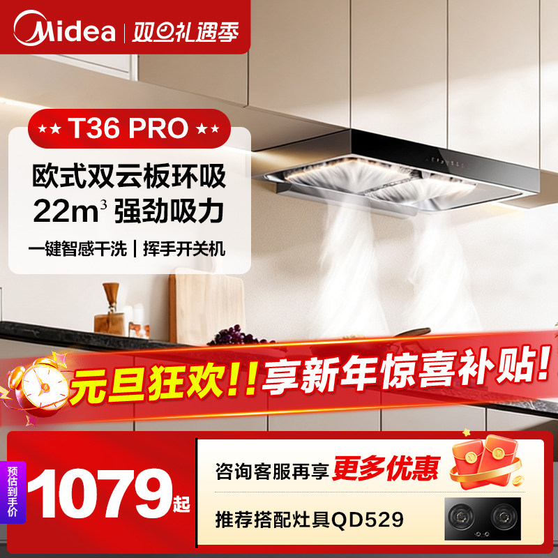 美的抽油烟机T36 PRO家用厨房欧式顶吸式挥手智控自净洗吸油烟机