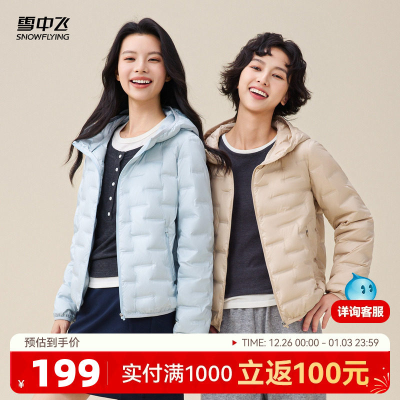 雪中飞2025冬新款女士分格轻薄短款连帽羽绒服简约时尚蓝色优雅