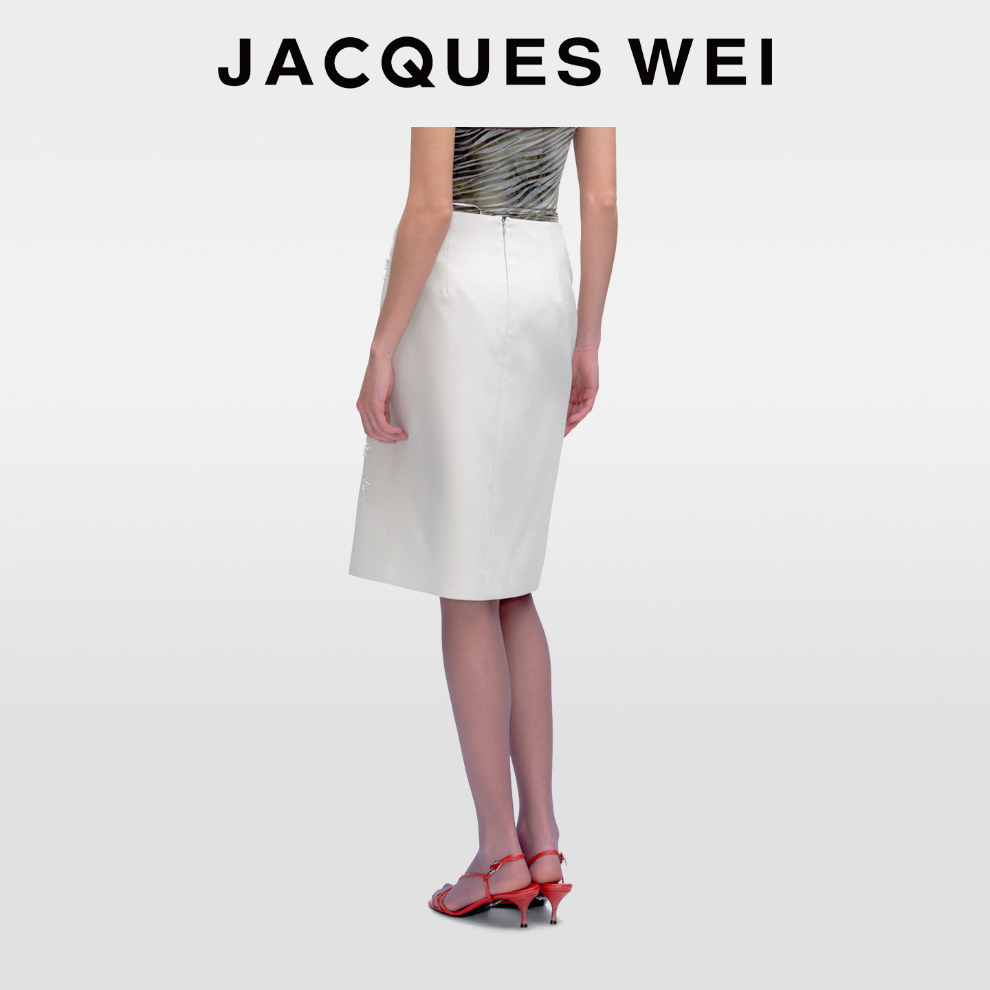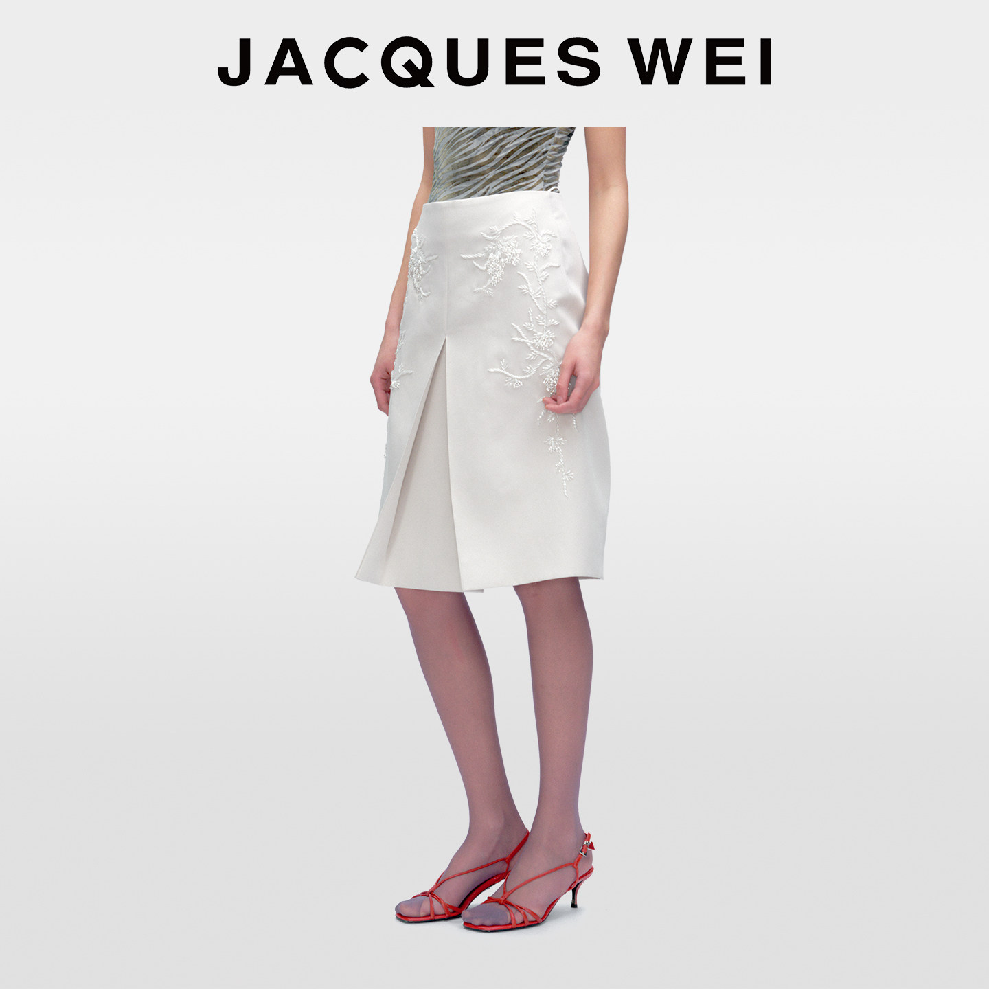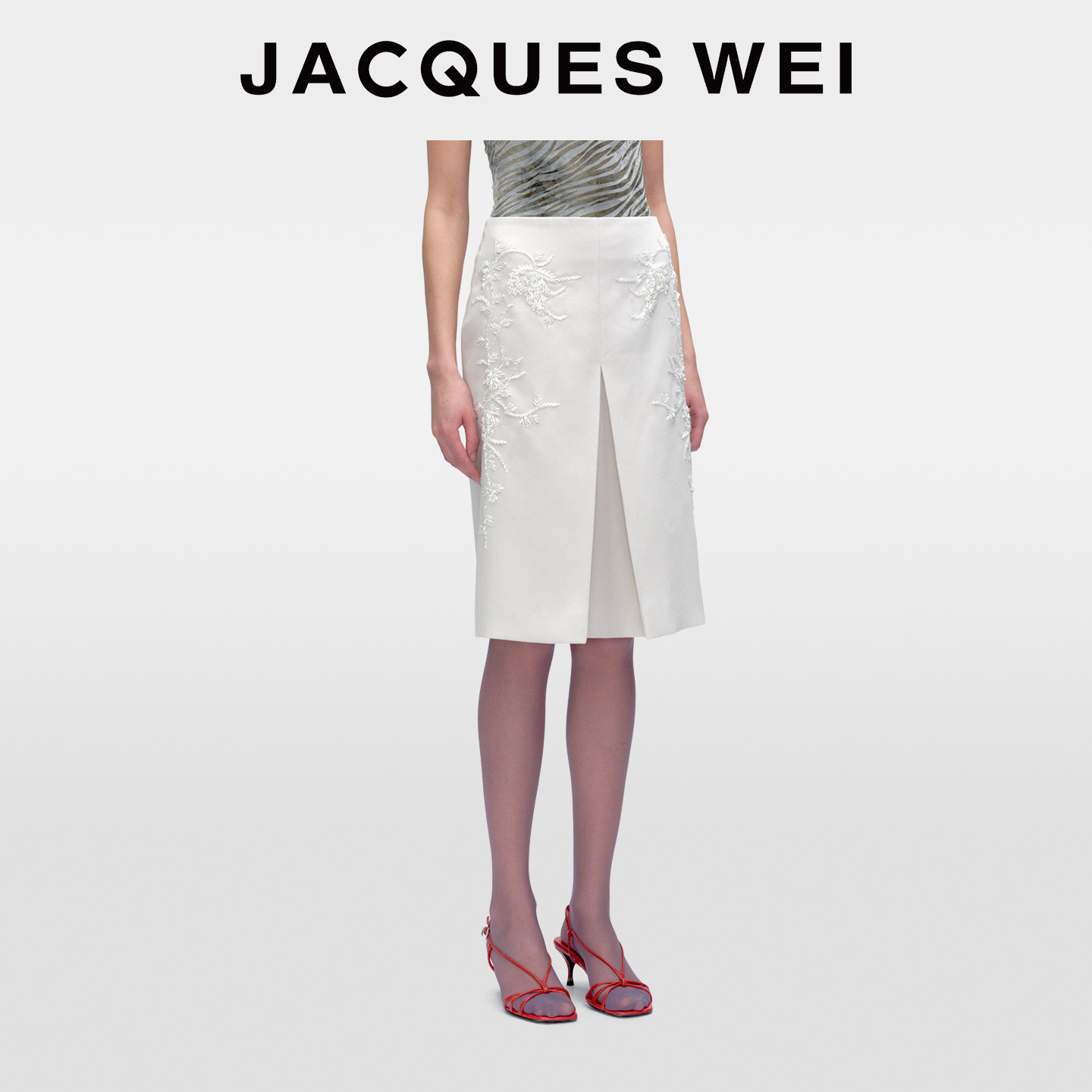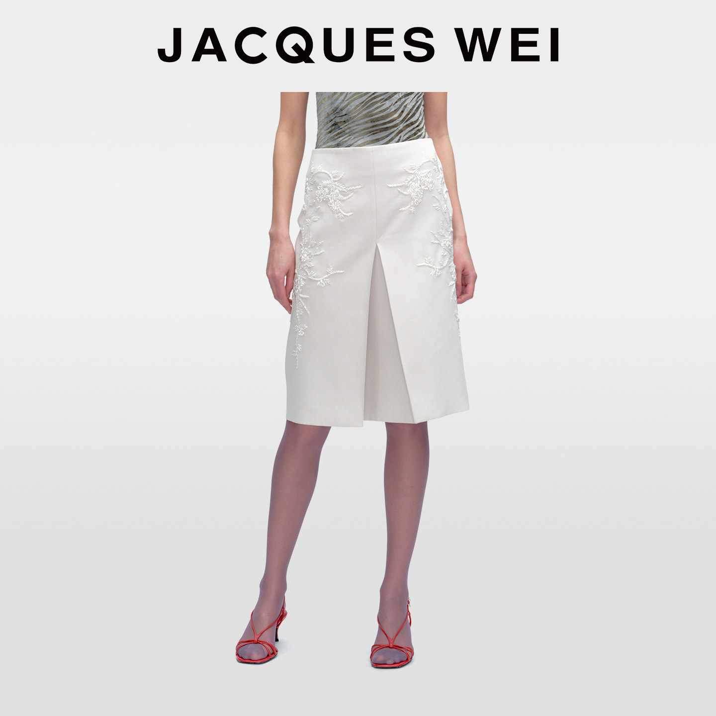 JACQUES WEI 2025新款秋冬设计师纯手工刺绣花卉开衩奶灰色半裙女