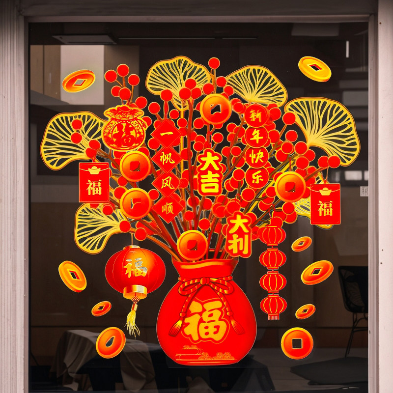 2025新年过年装饰发财树窗花贴福袋门贴玻璃贴纸蛇年春节静电贴画