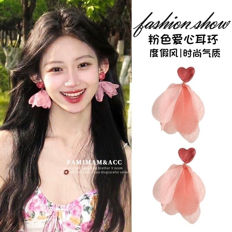 超仙粉色爱心网纱耳环女生度假风雪纺甜美耳钉夏季气质高级感耳饰