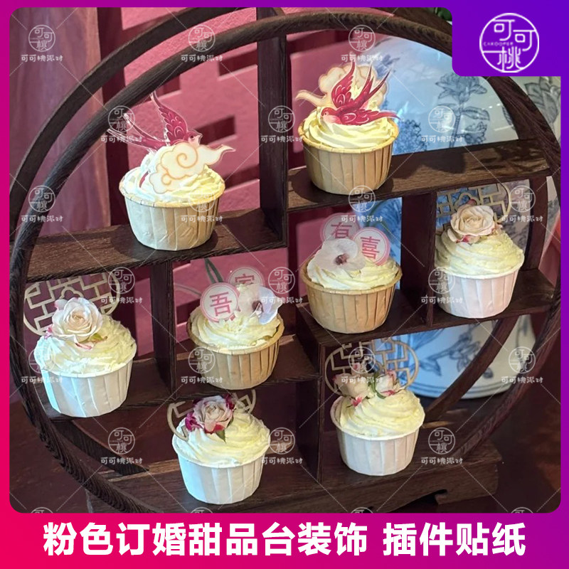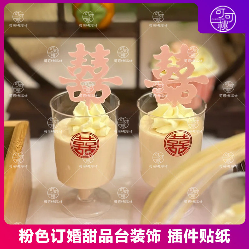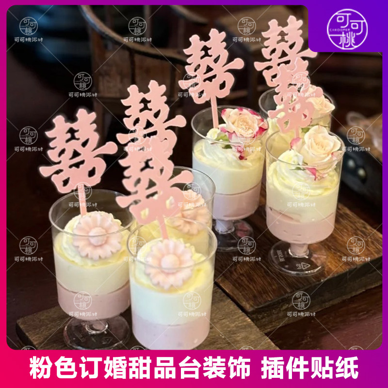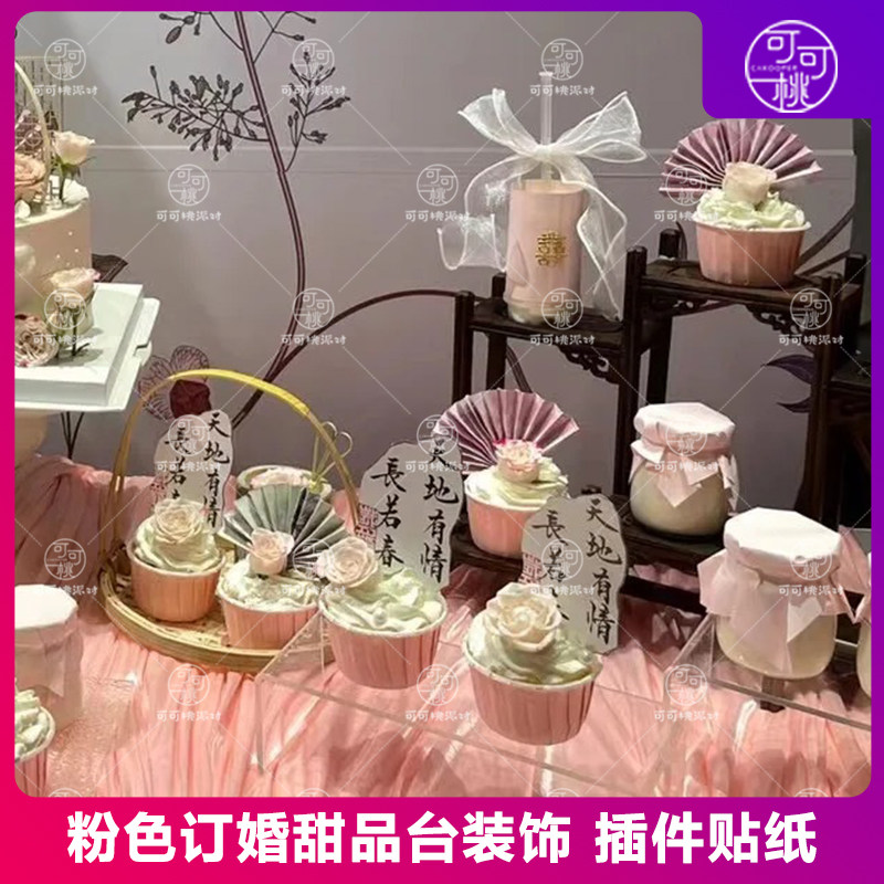 订婚宴甜品台装饰中式粉色喜字纸杯插件竹筒杯民族风毛球花边绑带