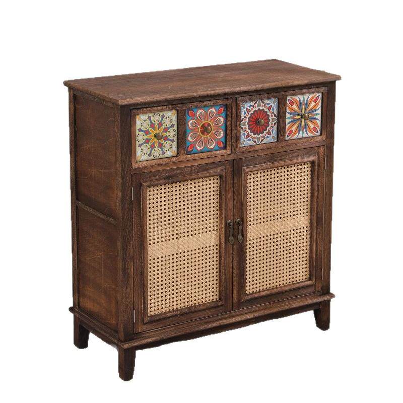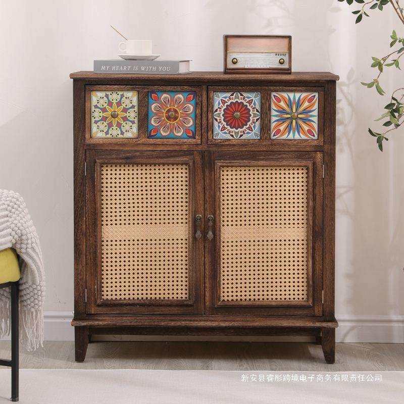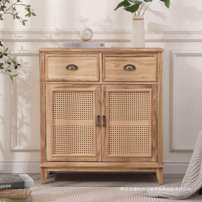 实木餐边柜藤编美式复古茶水柜客厅收纳柜民宿新中式储物柜阳台