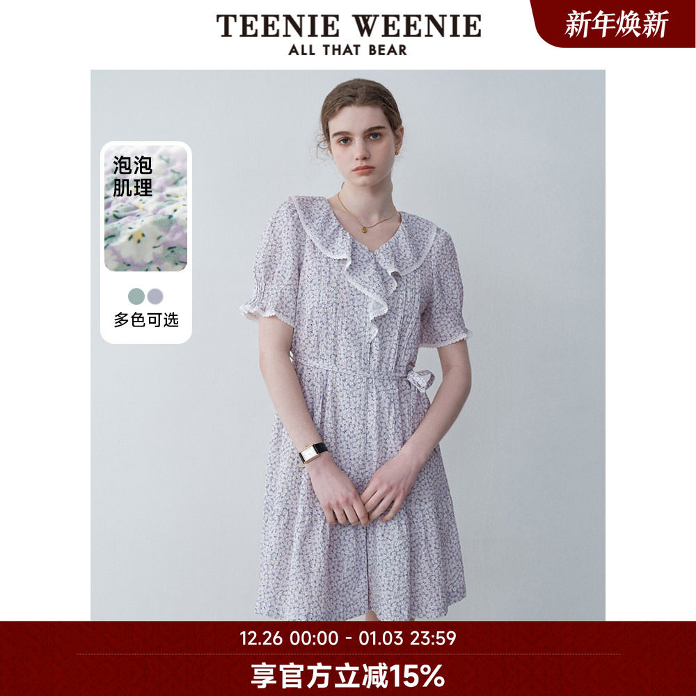TeenieWeenie小熊奥莱荷叶边法式田园碎花连衣裙收腰茶歇裙紫色女