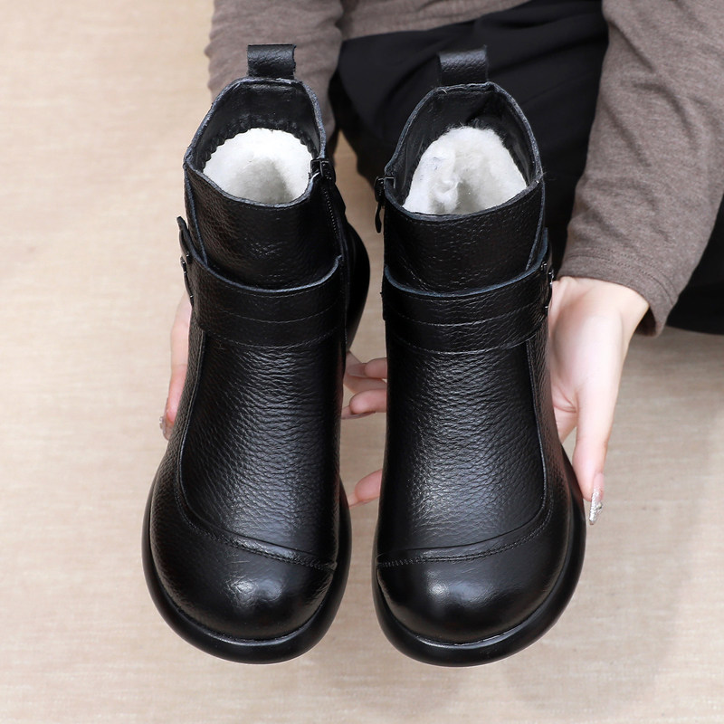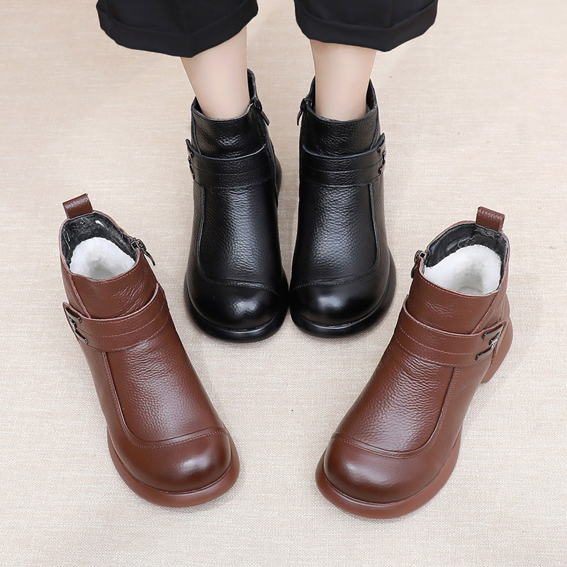 他她女孩冬季真皮羊毛短靴加绒保暖妈妈鞋棉鞋软皮软底舒适棉靴中