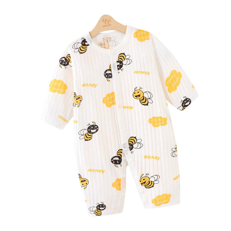 小猪大卫新生儿秋季保暖连体衣男女宝宝卡通印花中开夹棉爬服