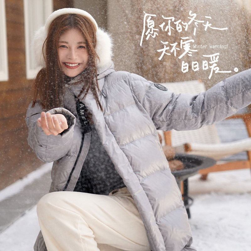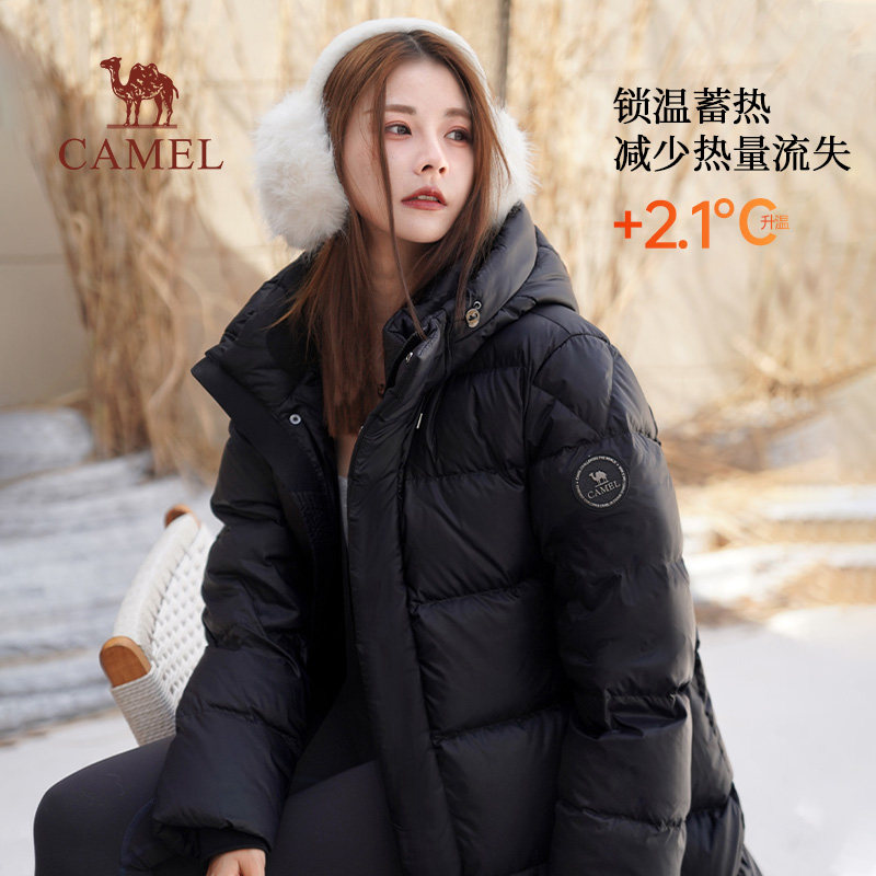 骆驼女装长款羽绒服2025新款冬季户外连帽加厚保暖黑色面包服外套