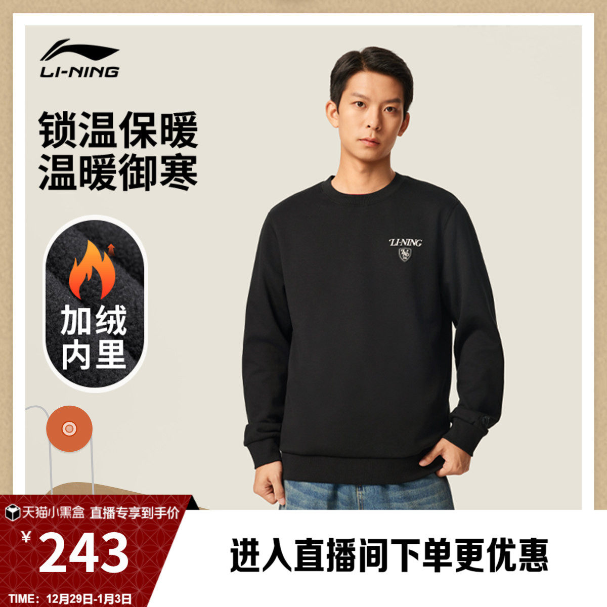 李宁加绒卫衣男士冬季官方新款男子上衣保暖加厚长袖男针织运动服