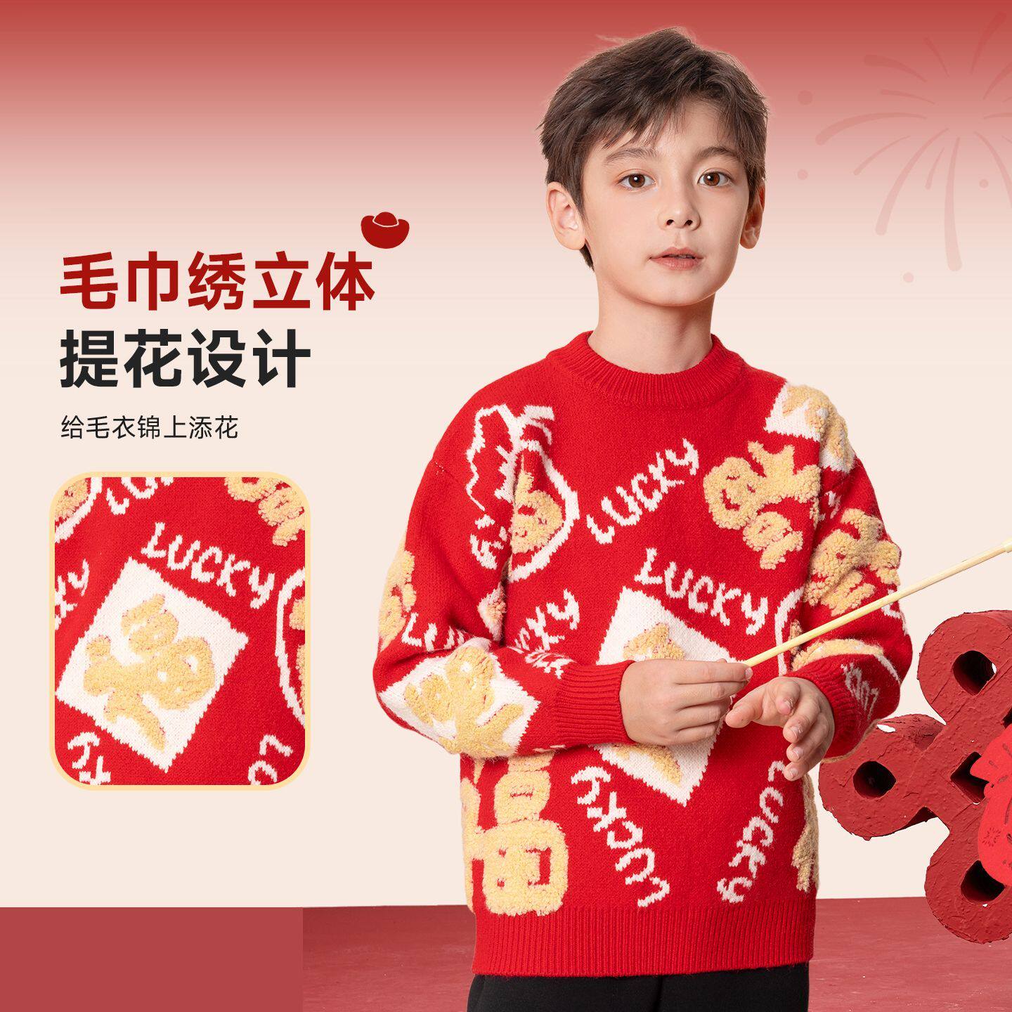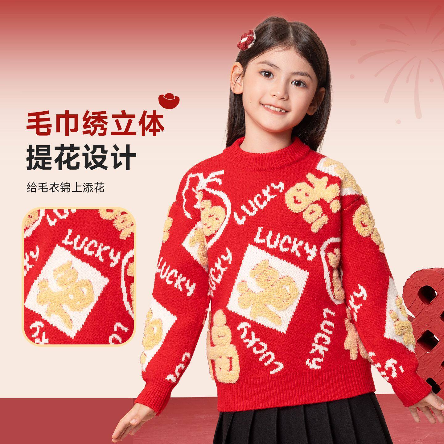 巴布豆儿童毛衣女童拜年服2026新款马年红色针织衫喜庆中大童冬装