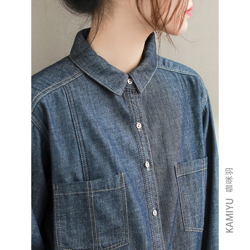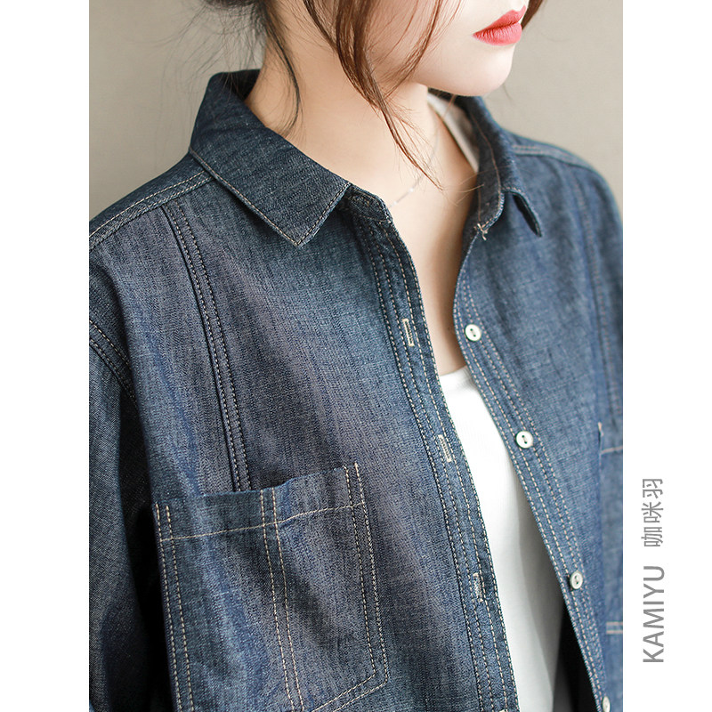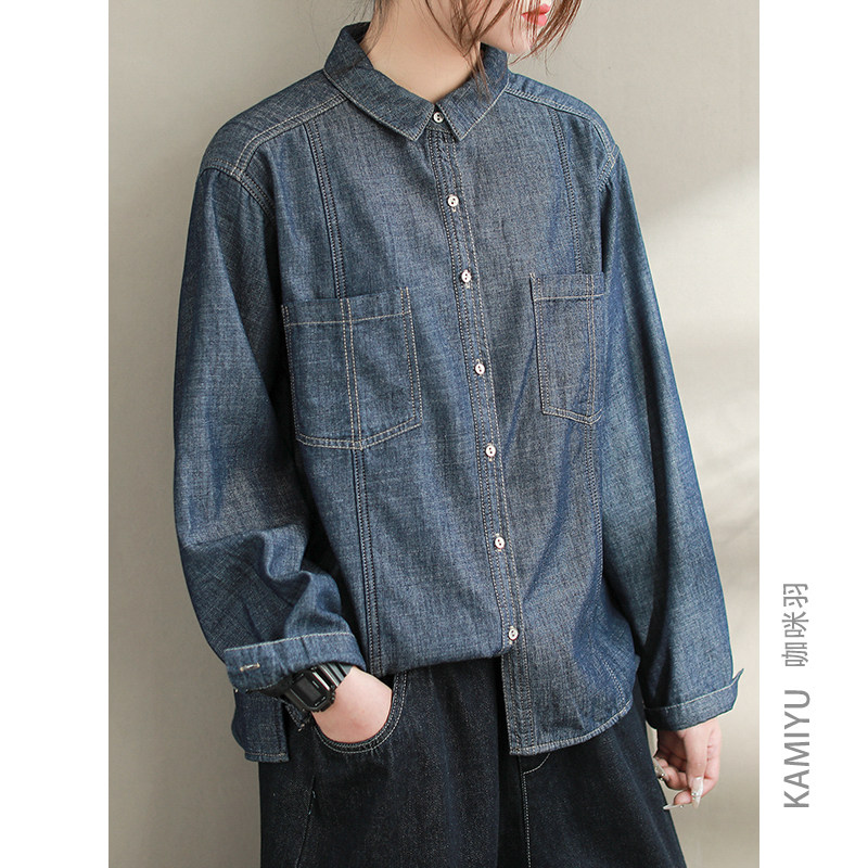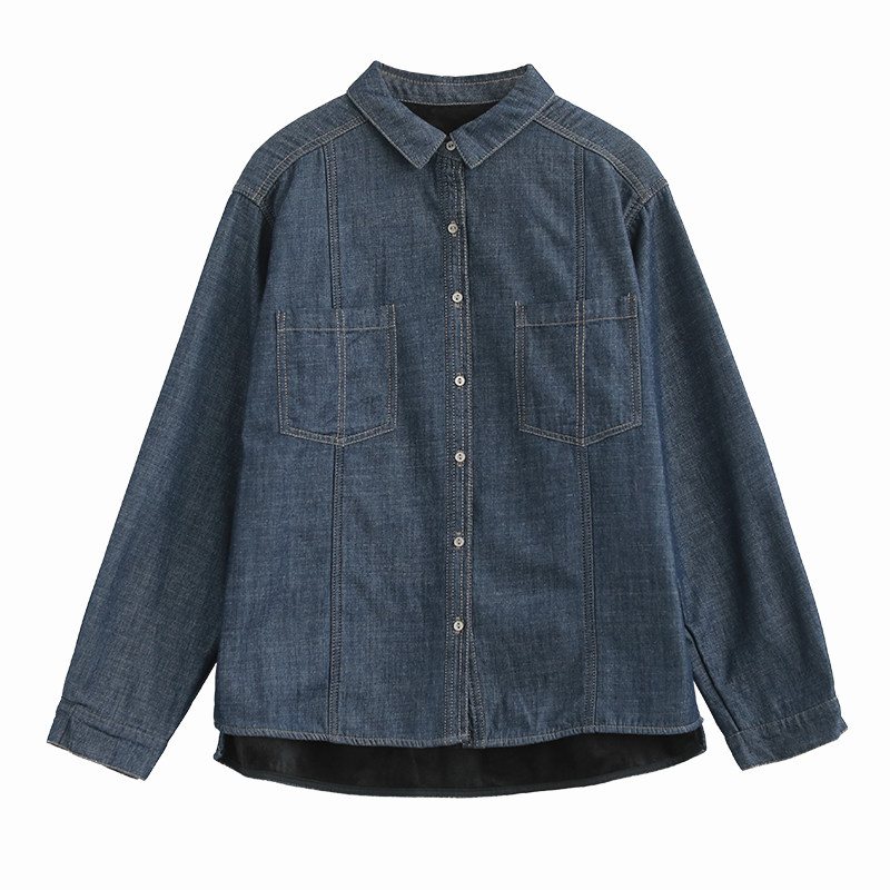 咖咪羽牛仔衬衫女春秋新款时尚宽松拼接棉质薄绒简约通勤休闲女款