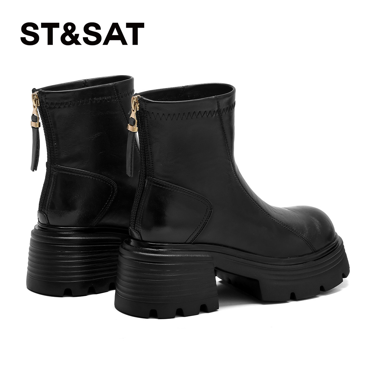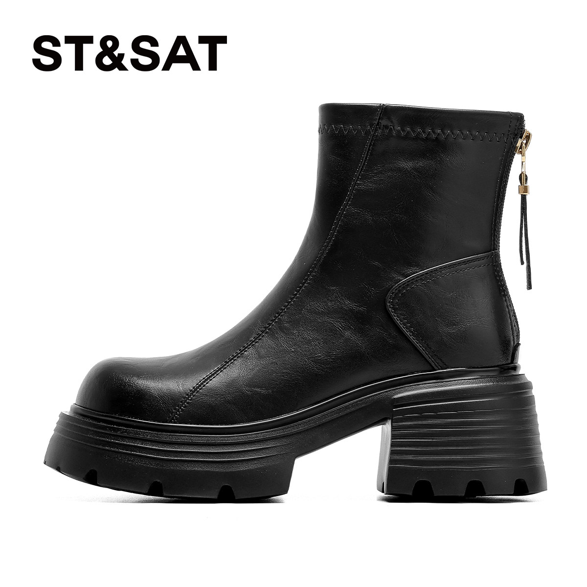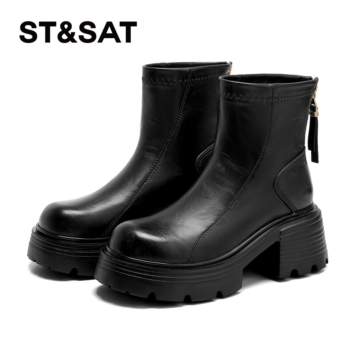 星期六黑色厚底短靴女款2025新款冬季增高粗跟瘦瘦英伦风马丁靴女