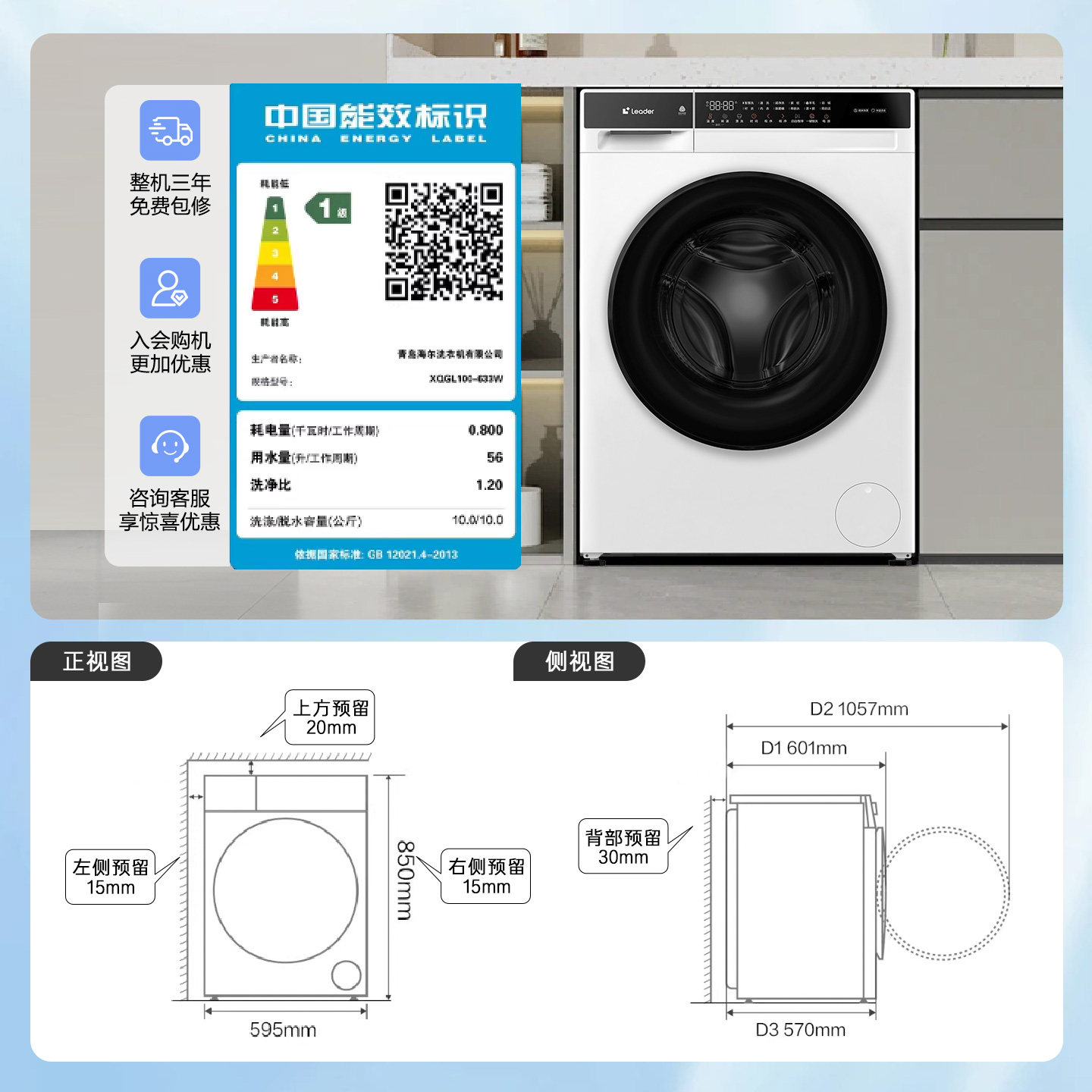 以旧换新补贴海尔出品统帅10kg滚筒洗衣机全自动超薄洗脱一体633