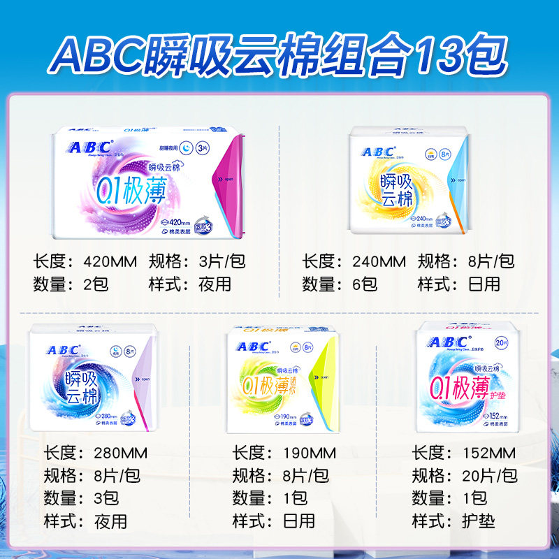 下拉享补贴ABC卫生巾姨妈巾日夜用瞬吸云棉极薄106片【正品】