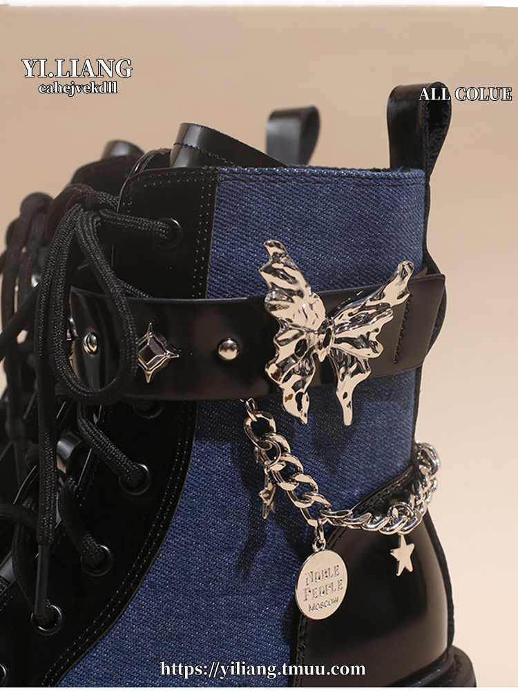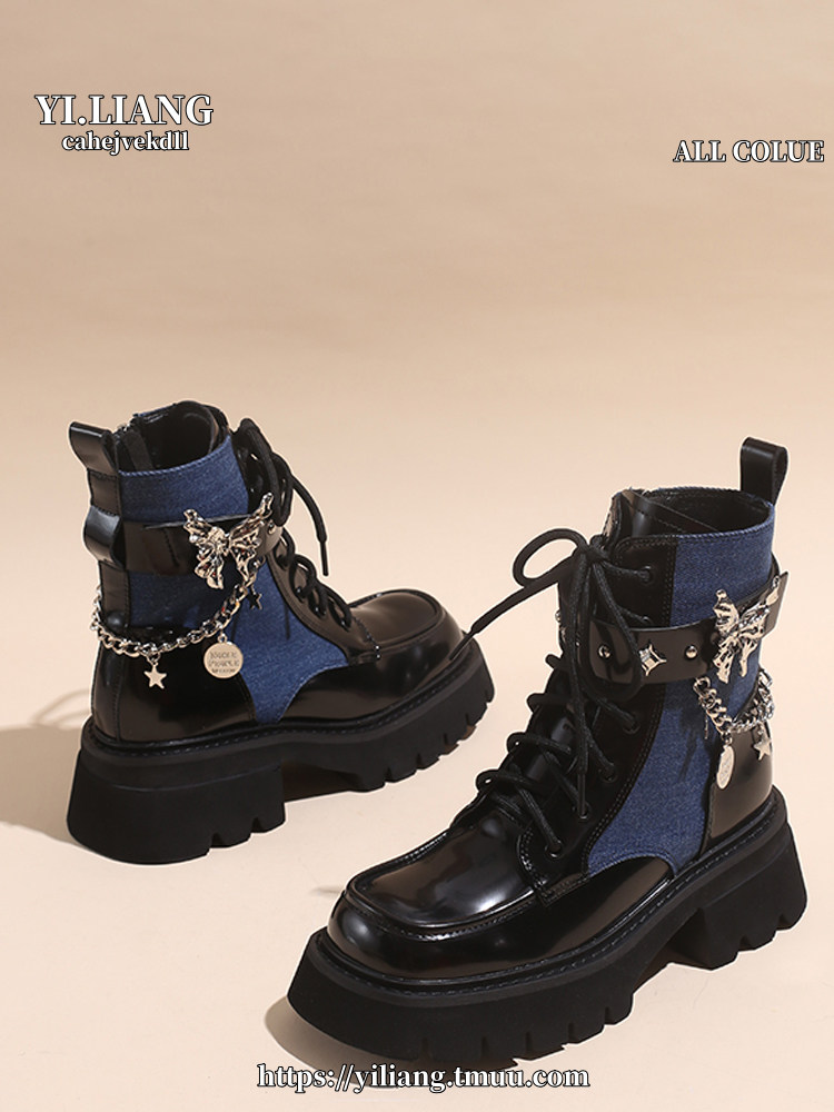 百搭马丁靴女厚底小众牛仔靴秋冬英伦风炸街小短靴黑色粗跟拼色