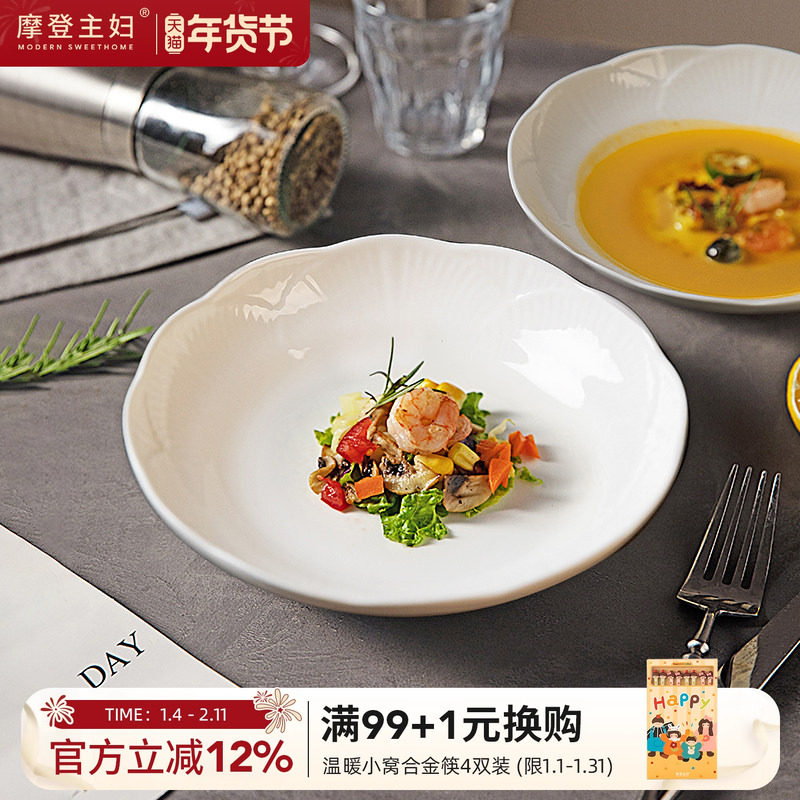 摩登主妇浮雕白色盘子家用菜盘陶瓷碟子高级感餐具牛排盘西餐餐盘