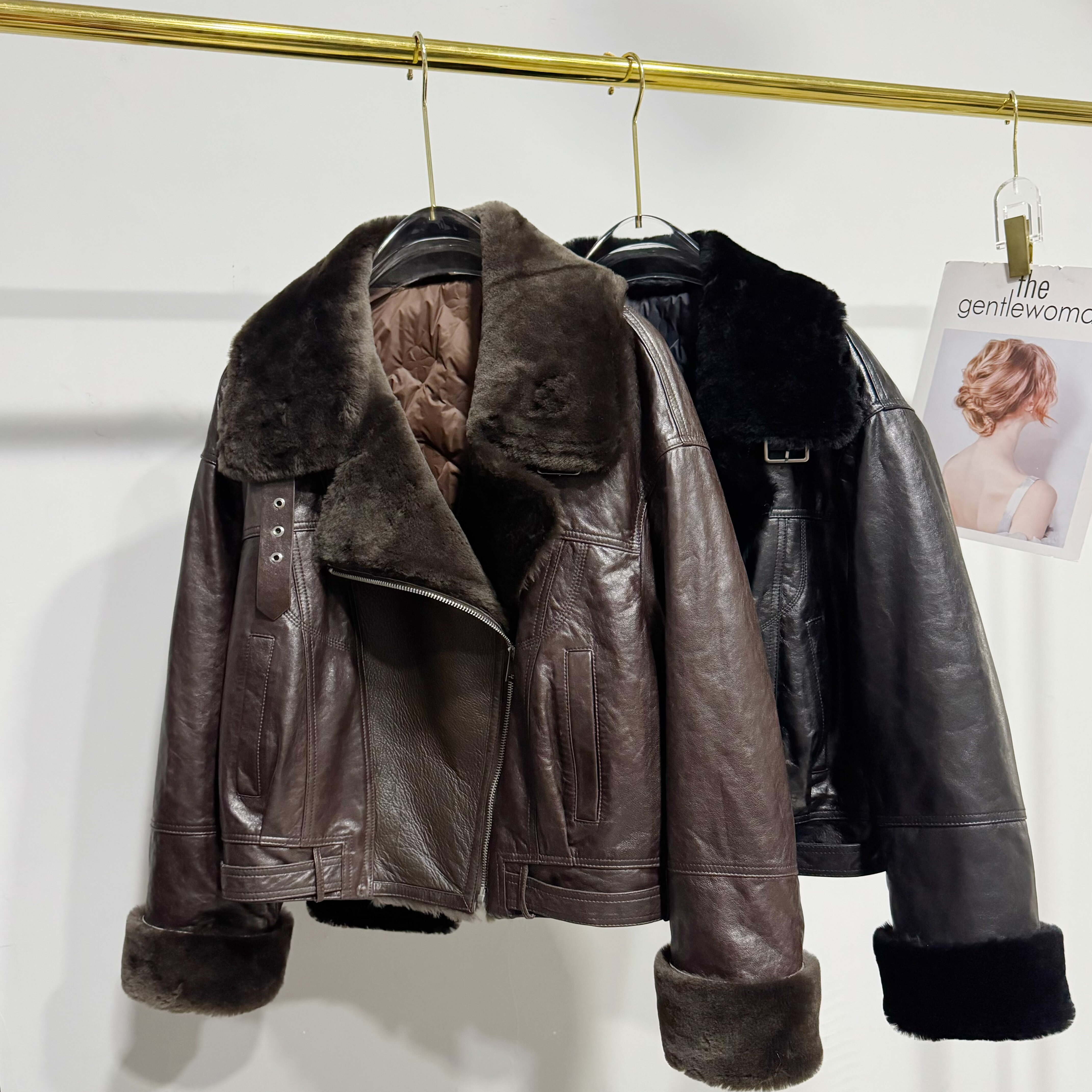 欧货秋冬新款进口冷萃油蜡头层绵羊皮鹅绒服皮毛一体毛领羽绒外套