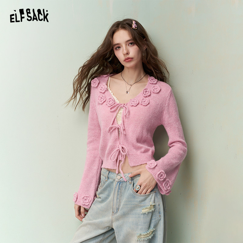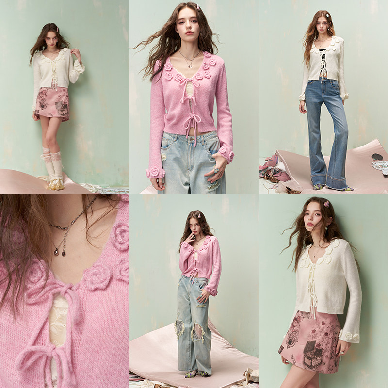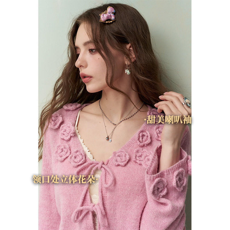 妖精的口袋白色立体花朵v领针织开衫女2026年早春新款甜美喇叭袖