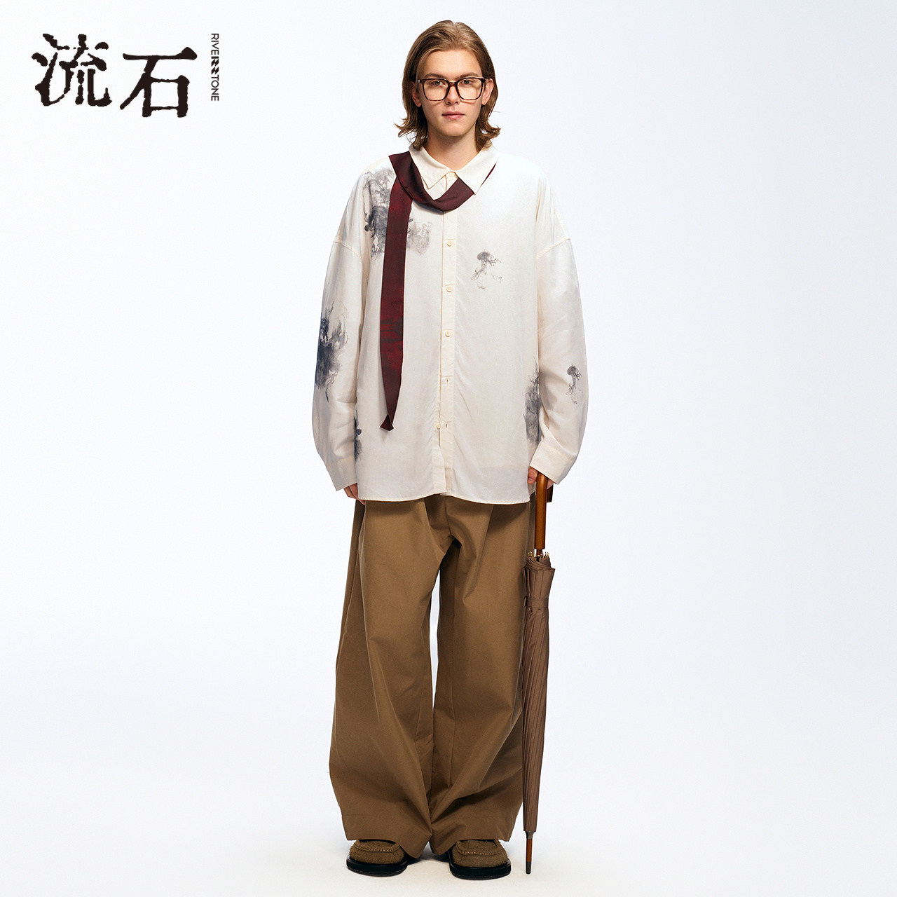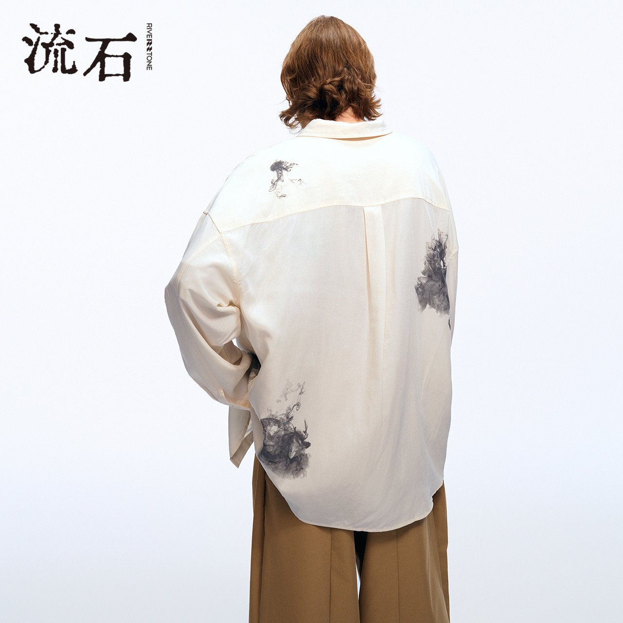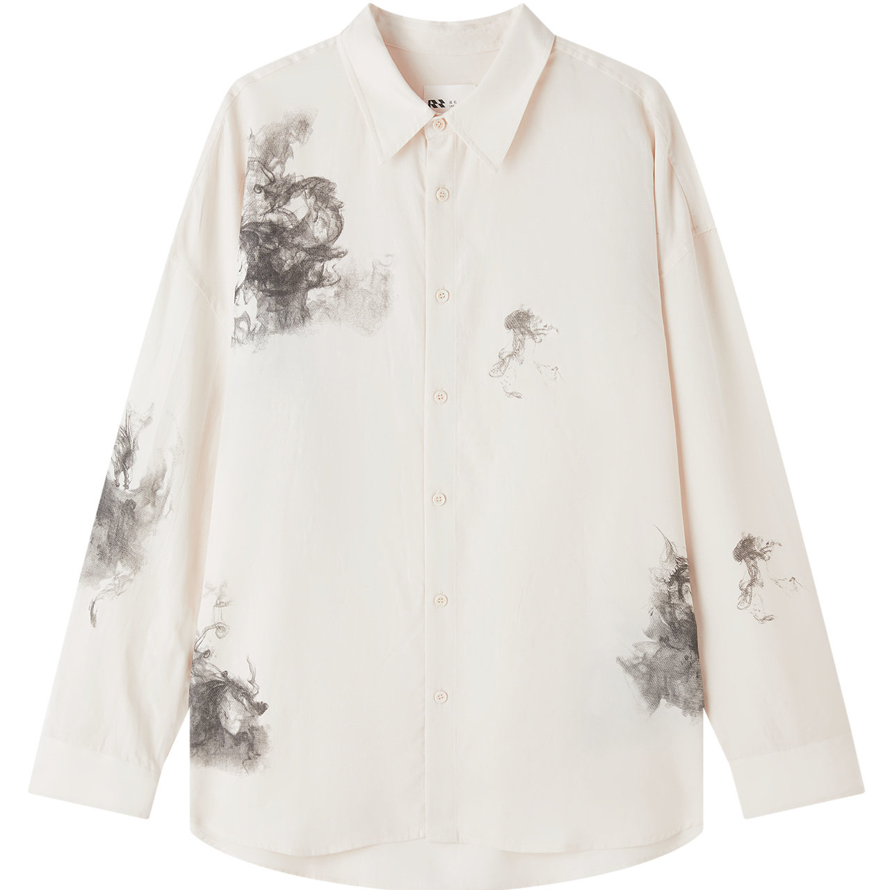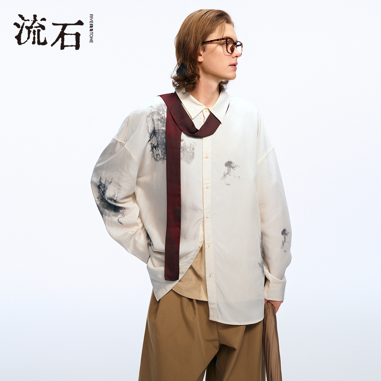 流石男装水墨风长袖衬衫2026年春季新款男士新中式龙图案印花衬衣