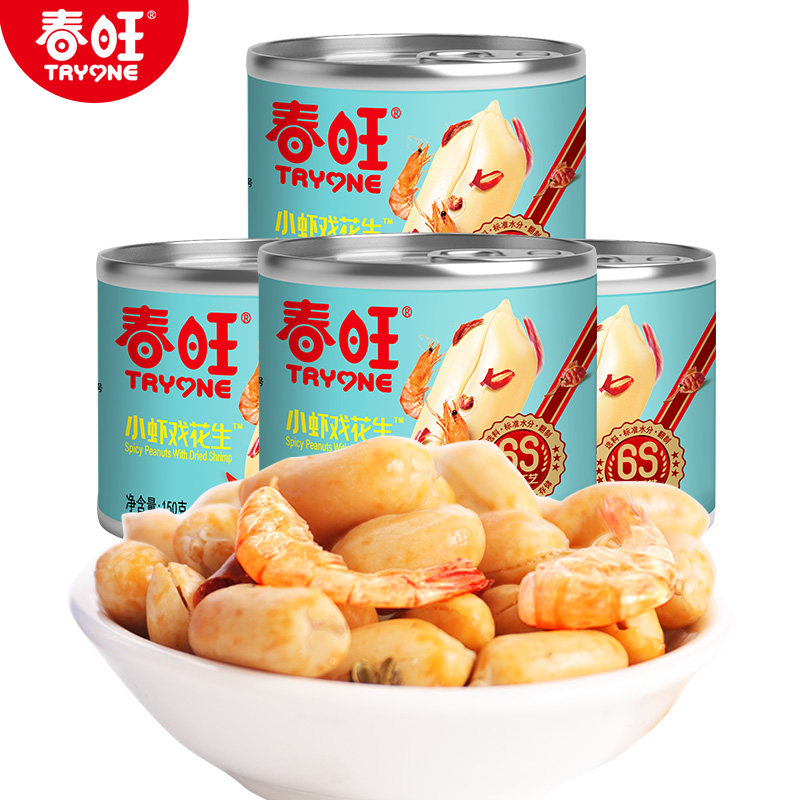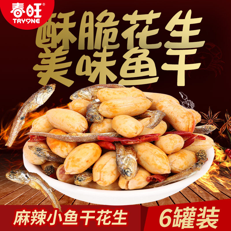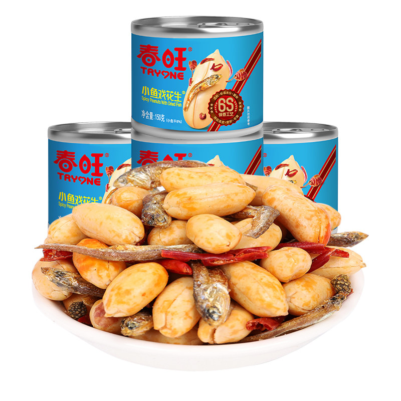 春旺花生米麻辣小鱼干小虾花生零食山东特产下酒菜150g罐装小吃