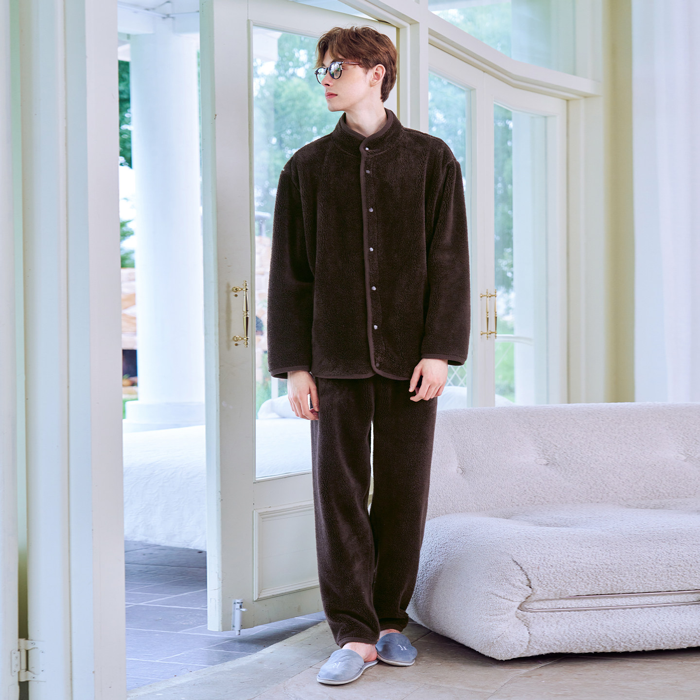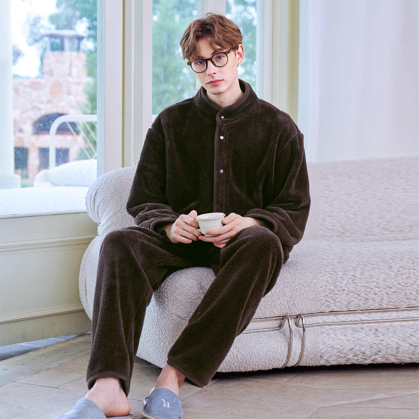 秋冬季珊瑚绒加厚加绒款三层夹棉袄男士睡衣保暖家居服套装可外穿