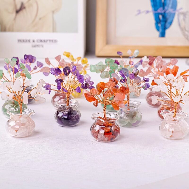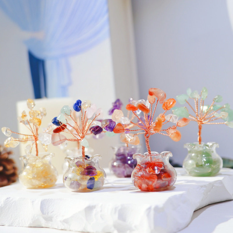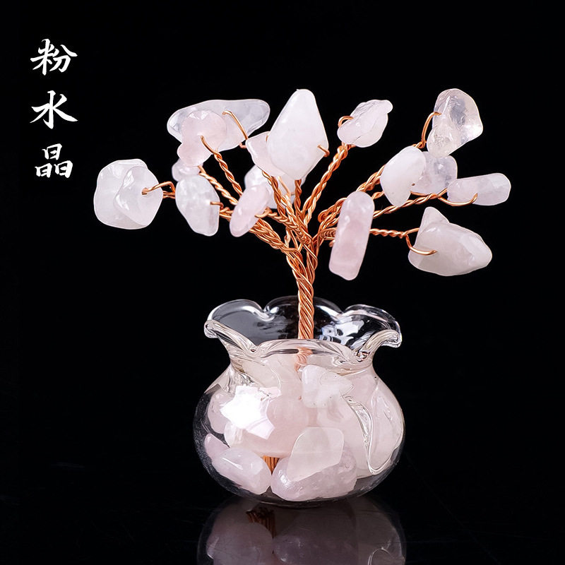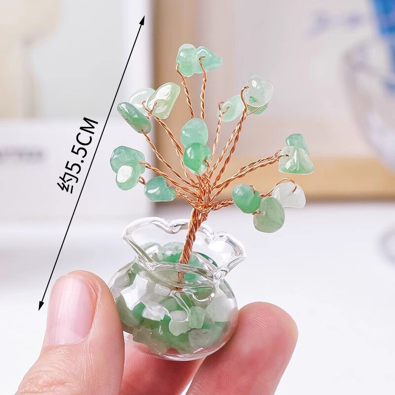 天然水晶碎石手工编织家居车载迷你水晶发财树小摆件黑曜石