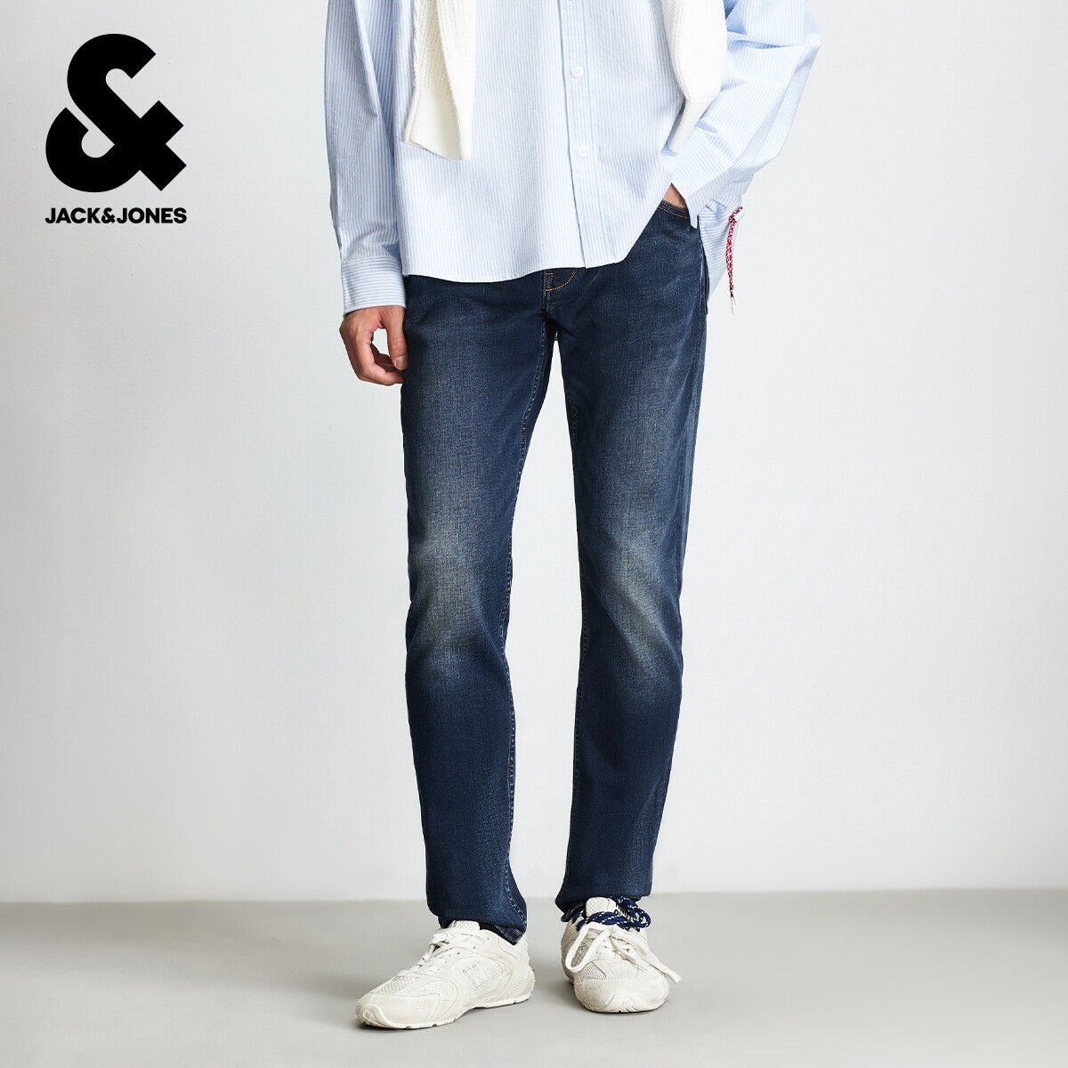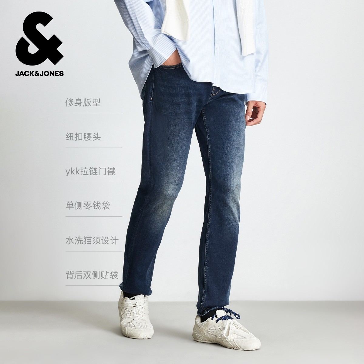 杰克琼斯男装牛仔裤冬季新款简约猫须水洗长裤弹力修身裤子男款