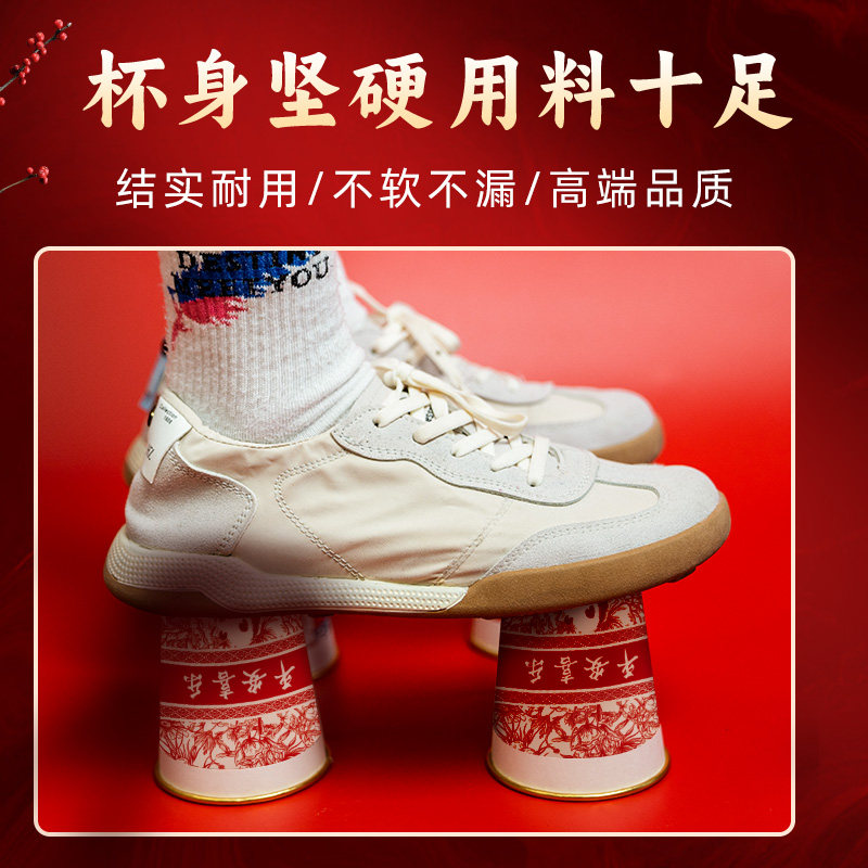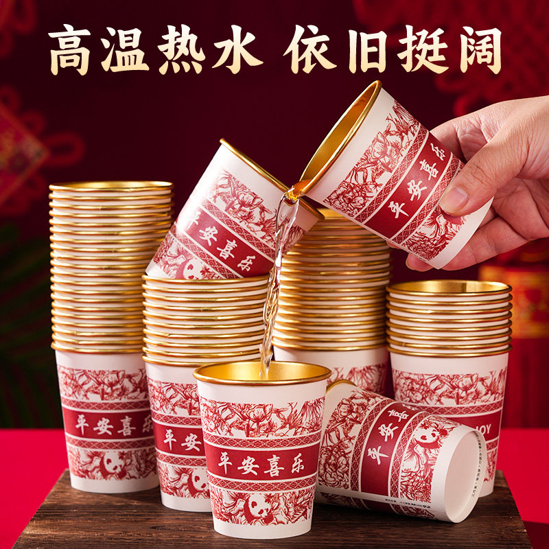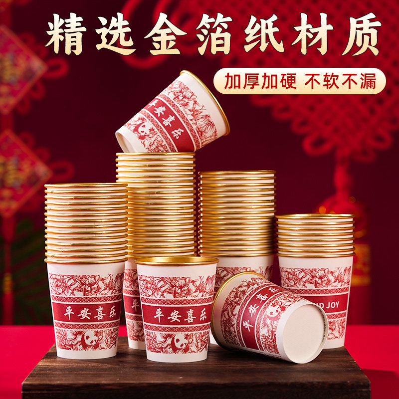 2026马年新年纸杯一次性杯子金箔高档纸杯子家用红色过年水杯加硬
