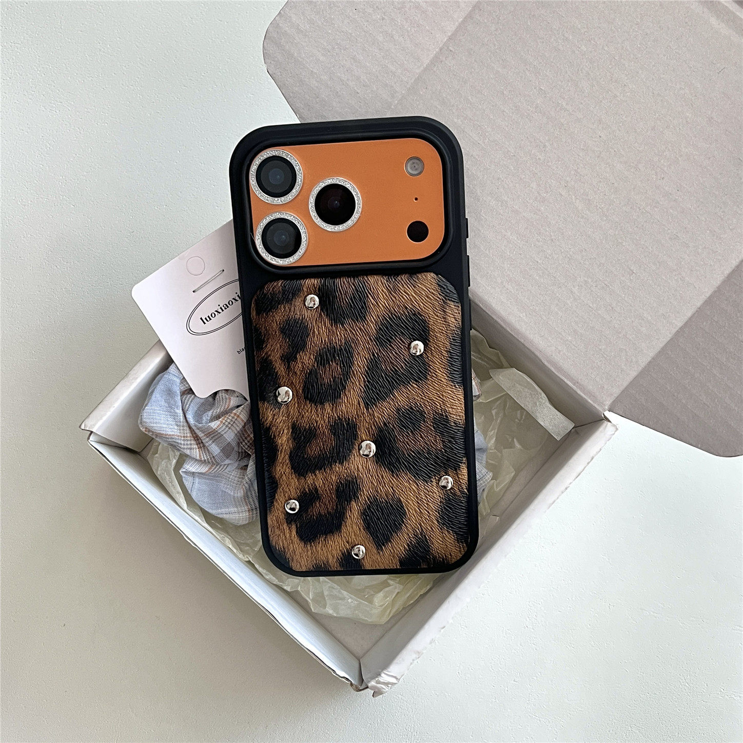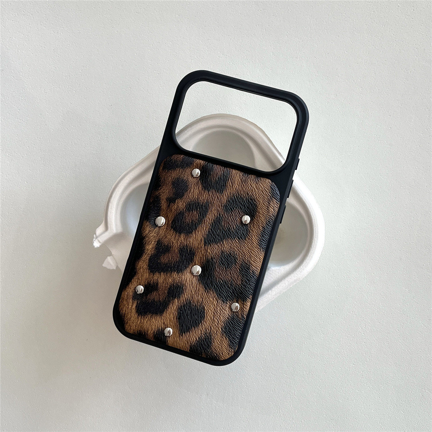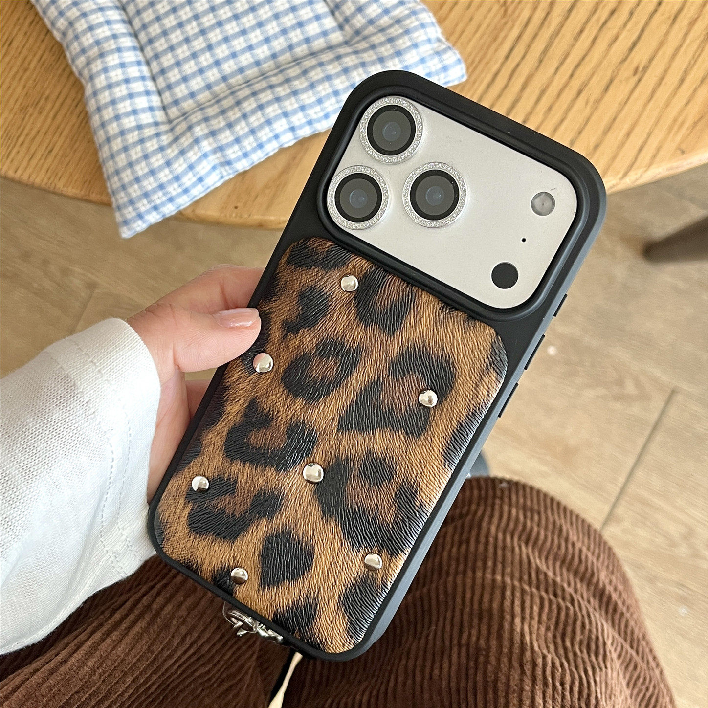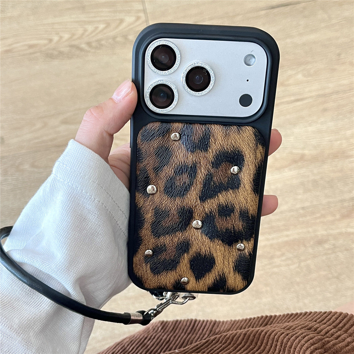 小众ins个性豹纹铆钉适用苹果17promax手机壳新款iphone16pro高级感14pro网红15带挂绳13皮质防摔保护套女款