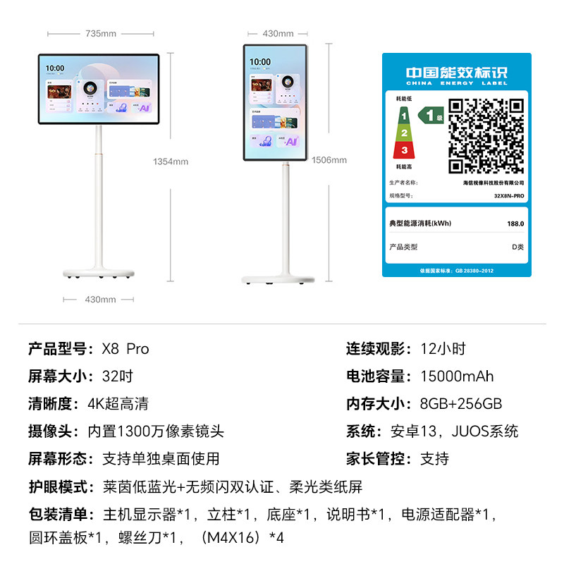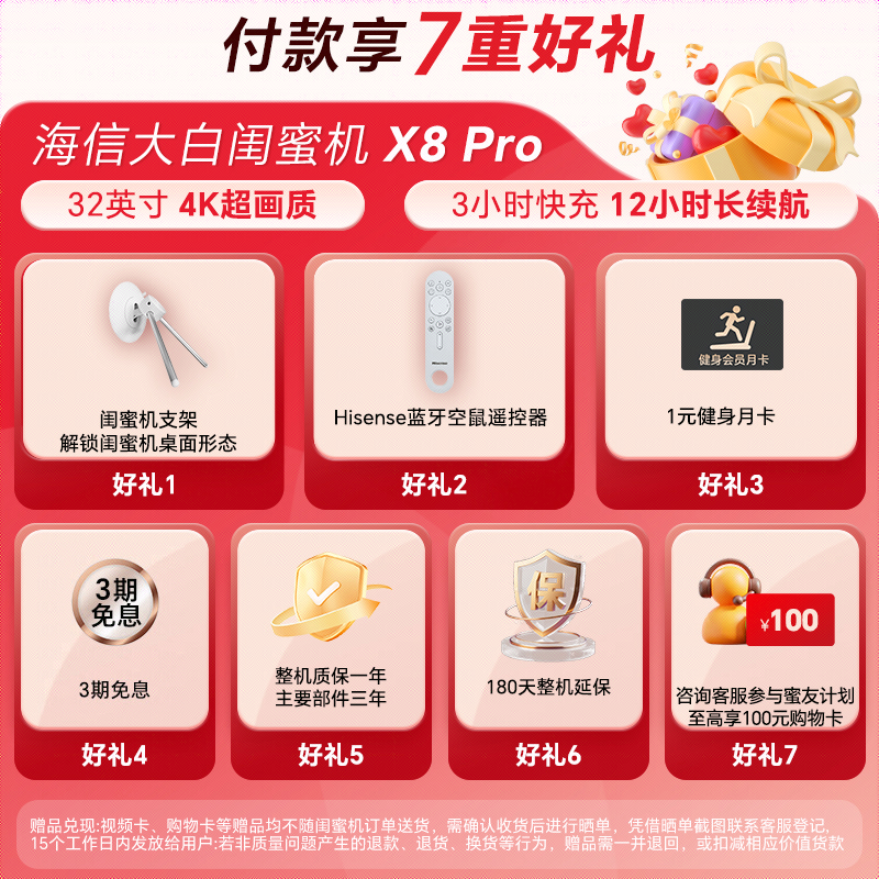 海信大白闺蜜机X8 Pro 32英寸4K 12H长续航 AI全新升级 女生礼物