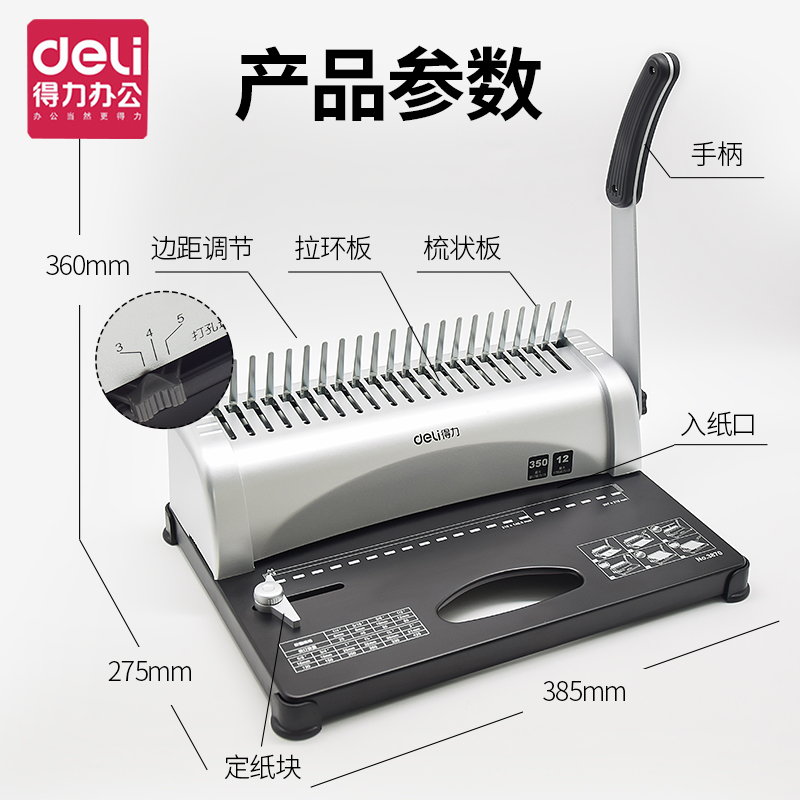 梳式胶圈装订机3870手动财务夹条21孔A4纸文件标书压条打孔机