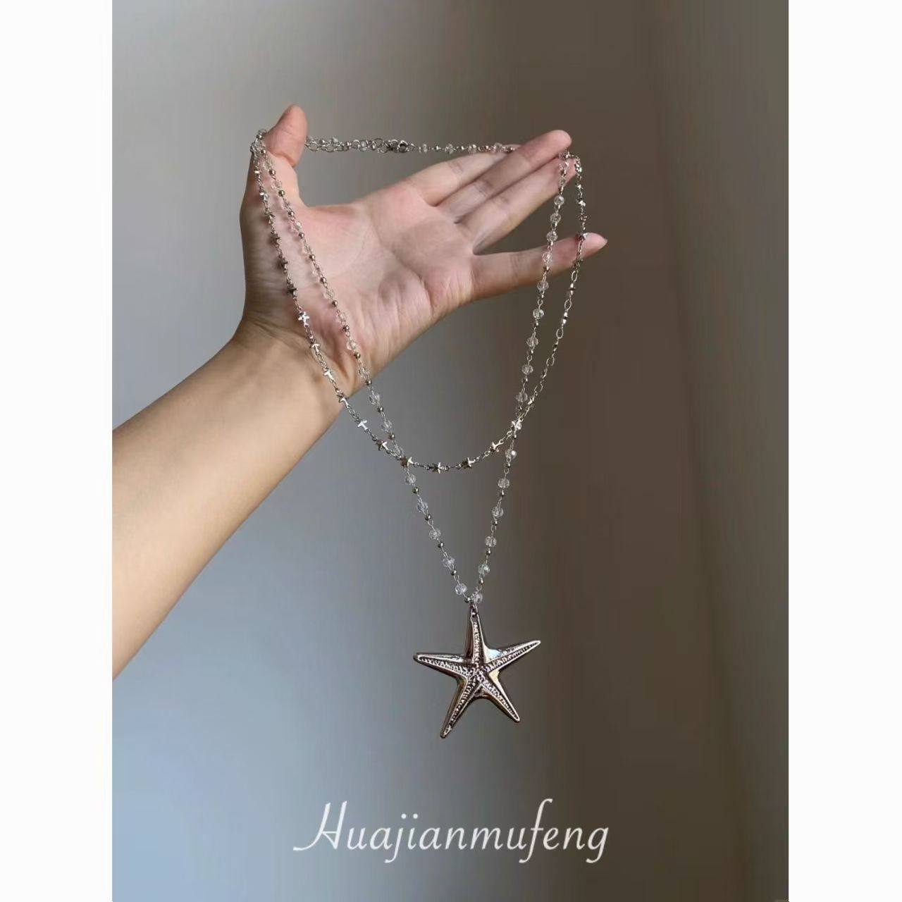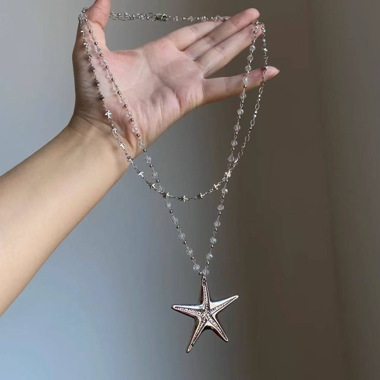 片!叠戴双层项链银色海星吊坠长项链毛衣颈链千禧辣妹风配饰锁骨