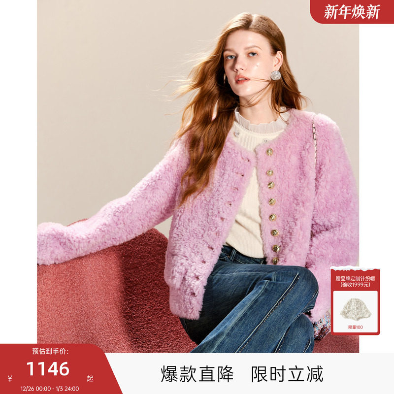 100%绵羊毛 可可尼COCOON2025冬季新款女粉色皮草高级小香风外套