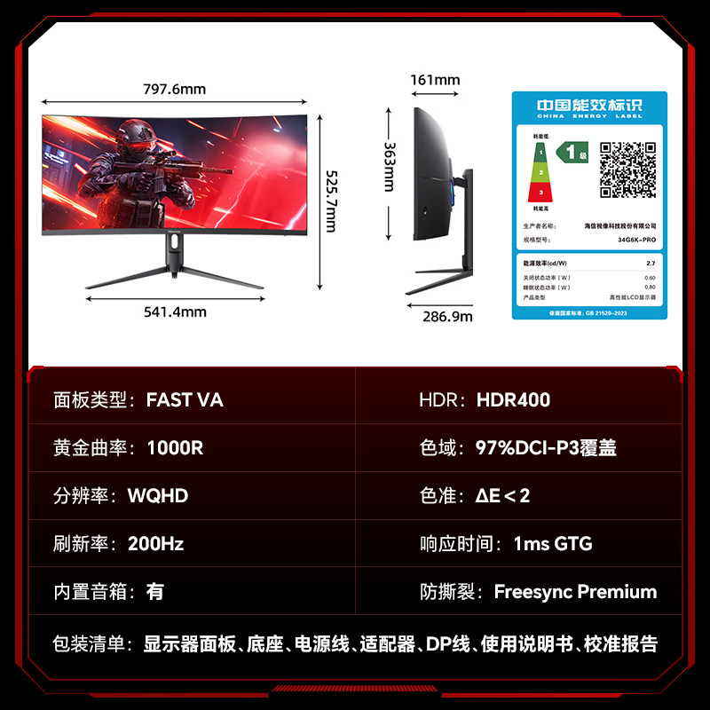 海信34英寸WQHD带鱼屏180Hz高刷1ms 1000R HDR400显示器34G6K-PRO
