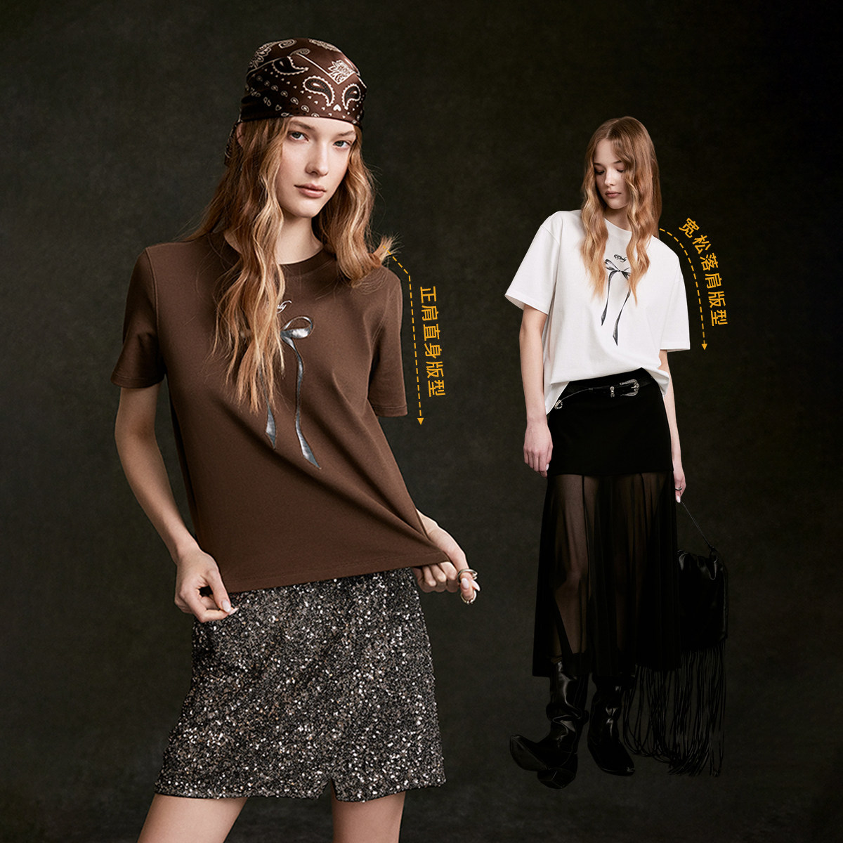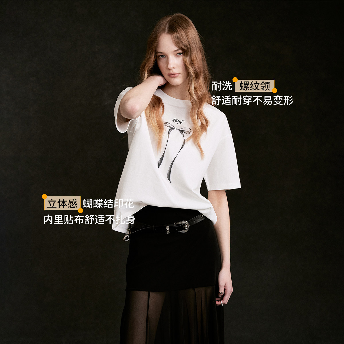 ONLY2026春季新款纯棉透气甜美刺绣立体印花蝴蝶结宽松阔版T恤女