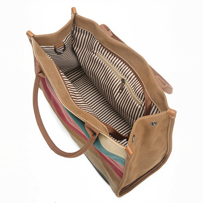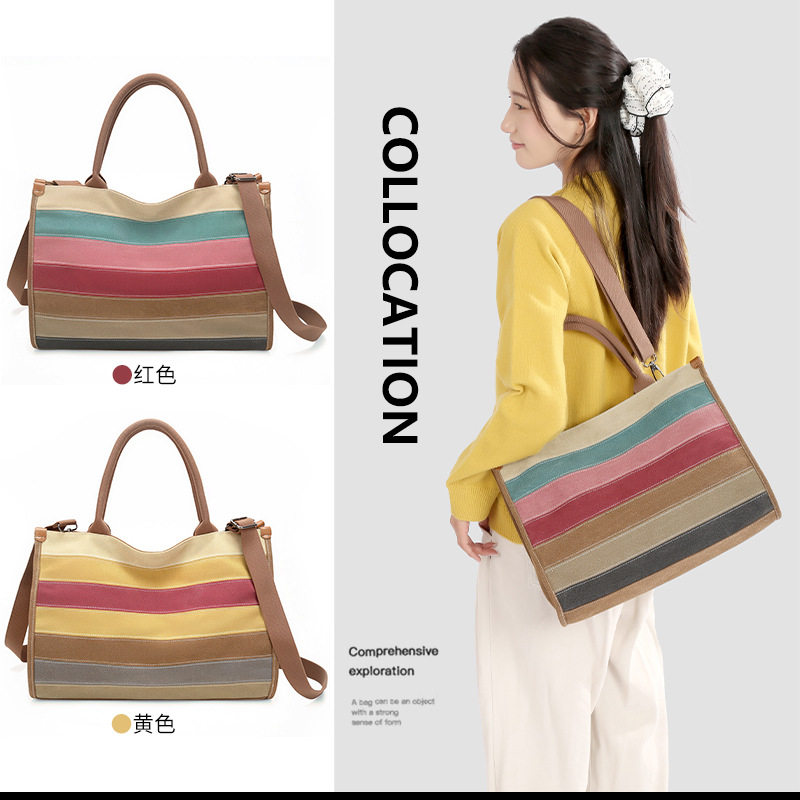 2025帆布条纹女包单肩大包复古斜挎包时尚单肩包女士拼接大容量