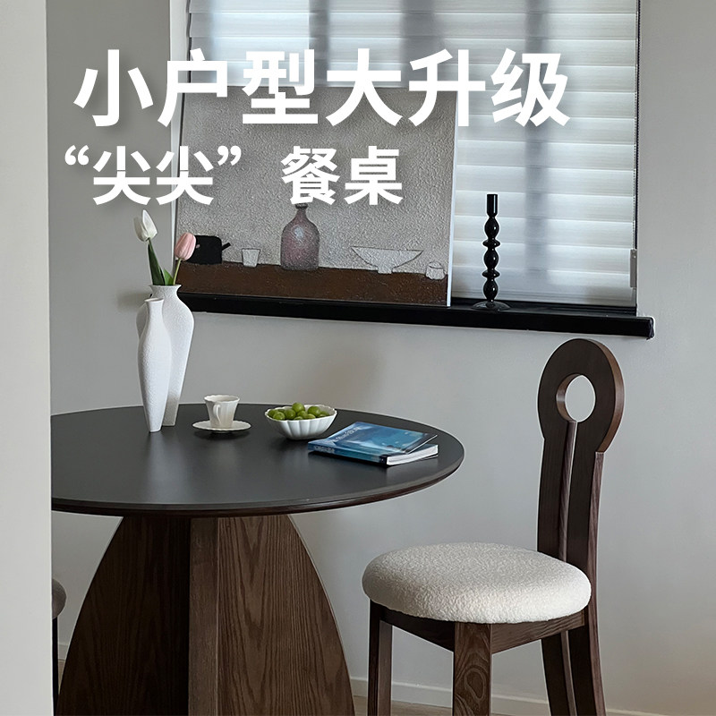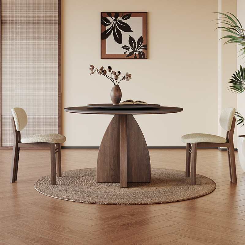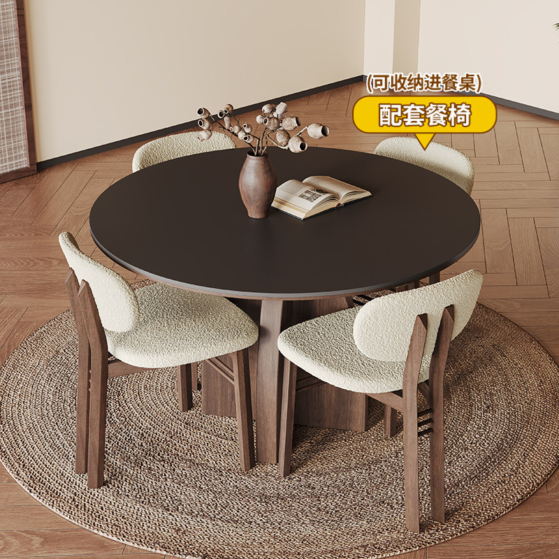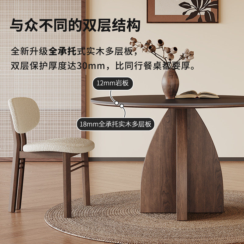 北欧实木圆桌带转盘家用胡桃色简约现代洽谈桌侘寂风黑色岩板餐桌