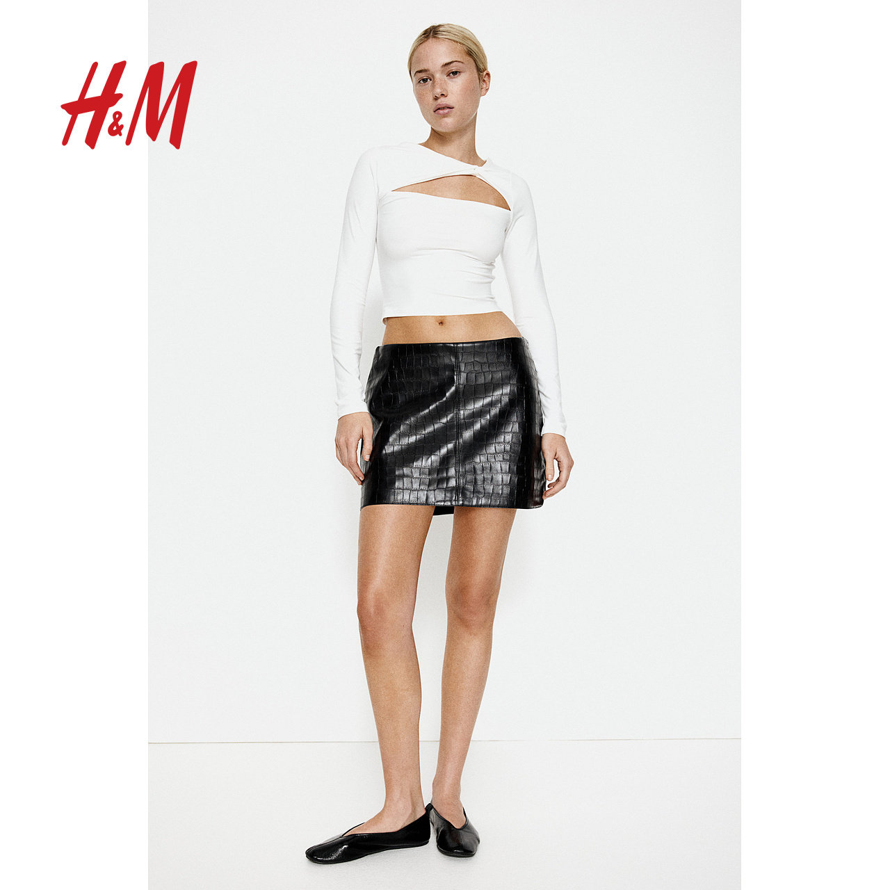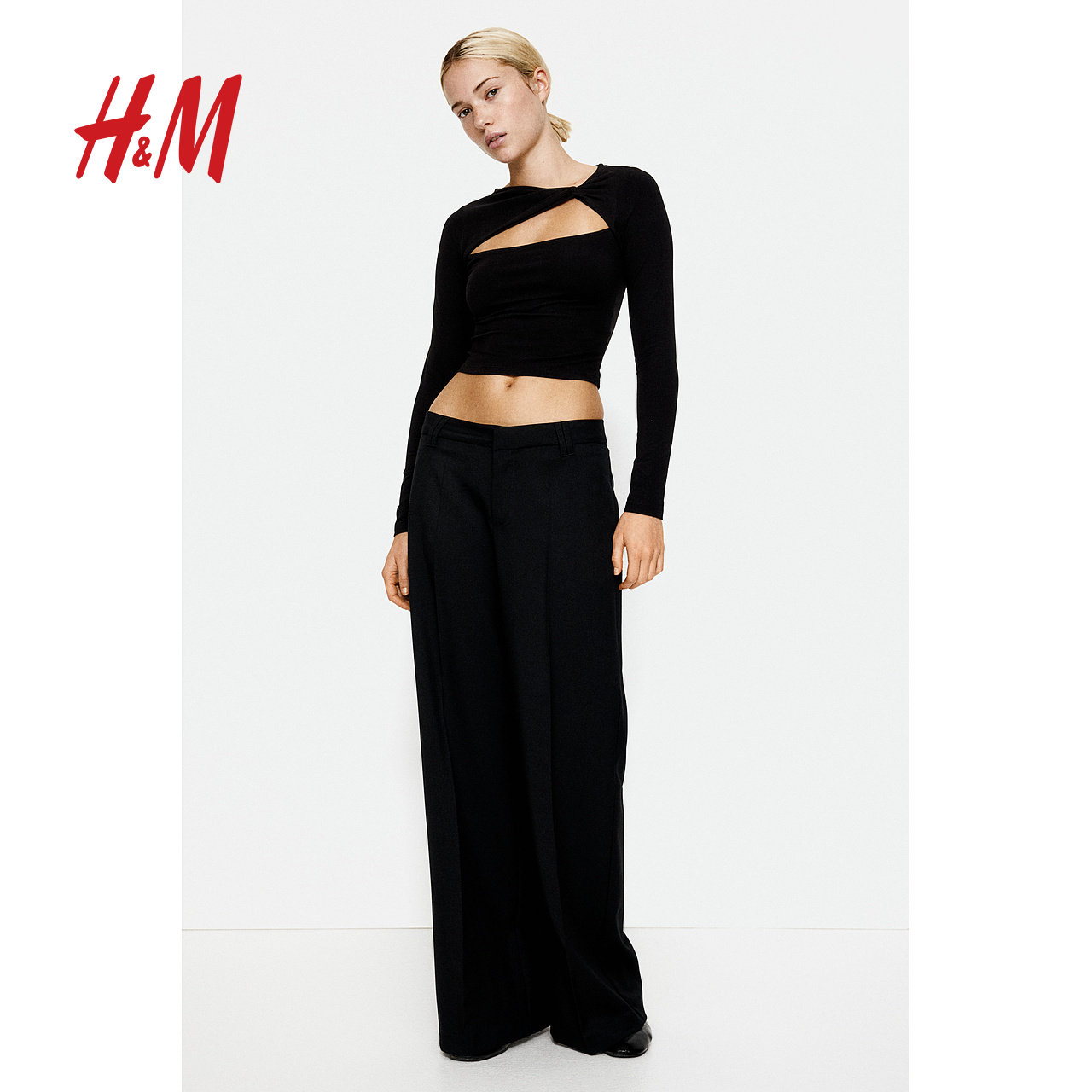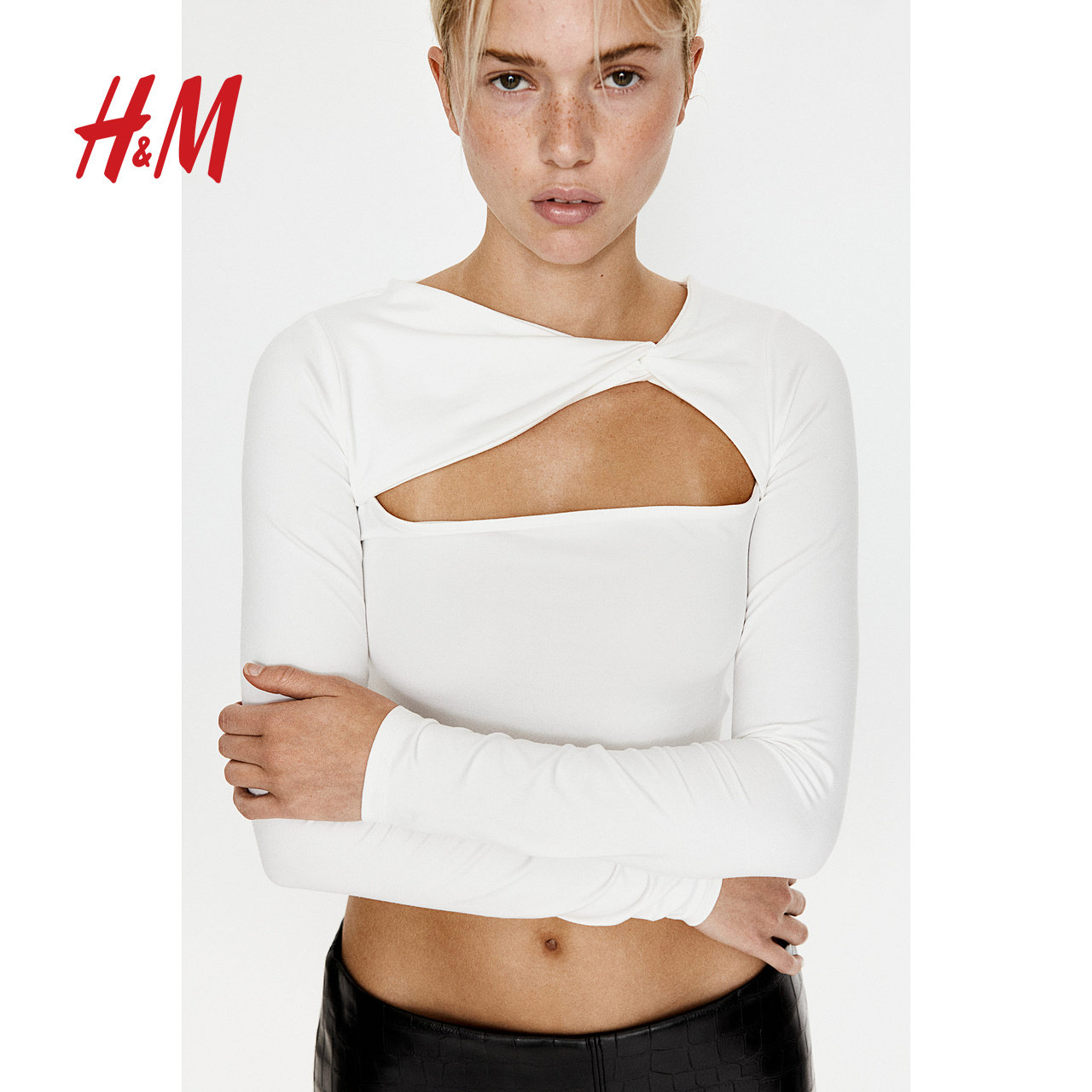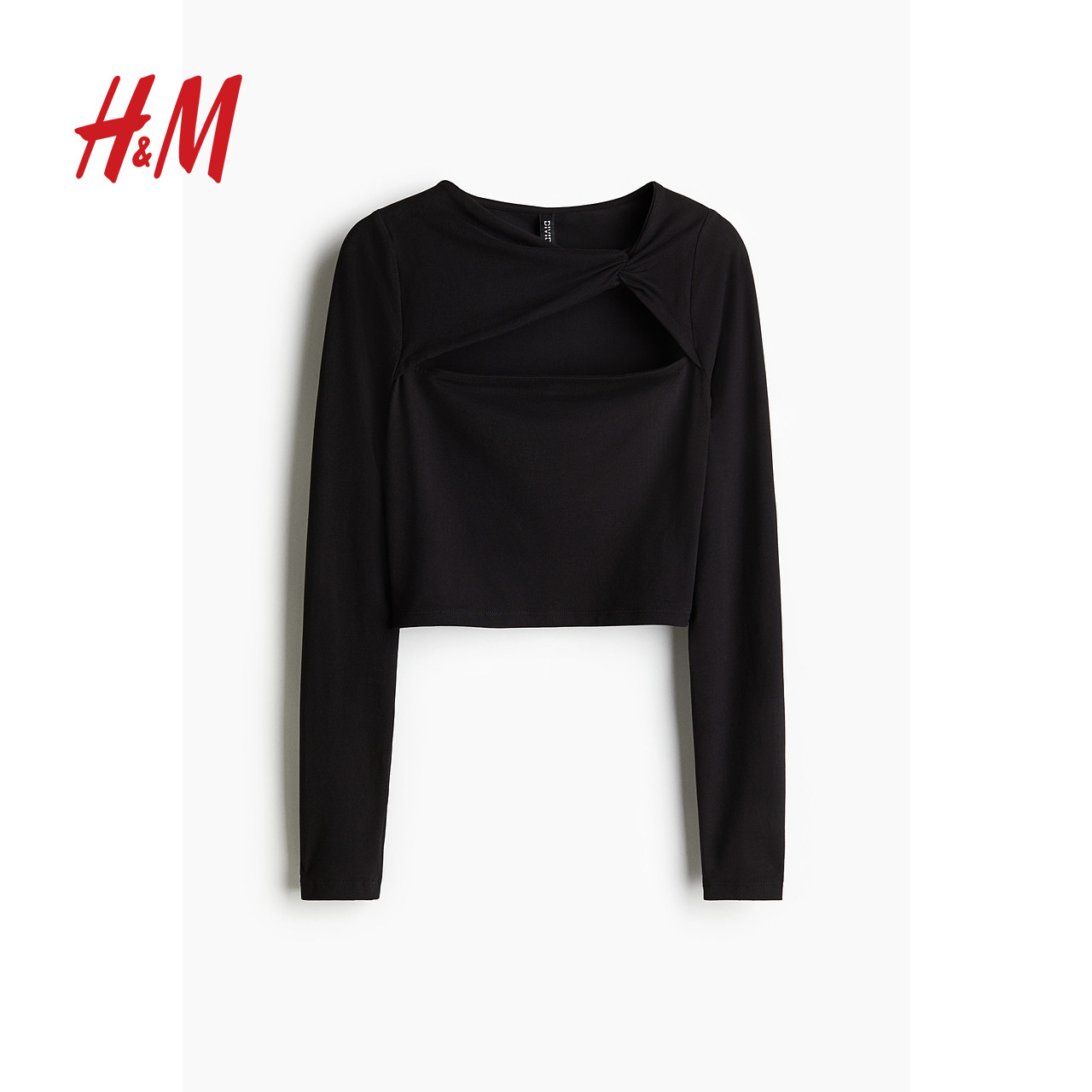 HM女装T恤冬季内搭打底衫扭结修身不对称领口时尚短上衣1291886