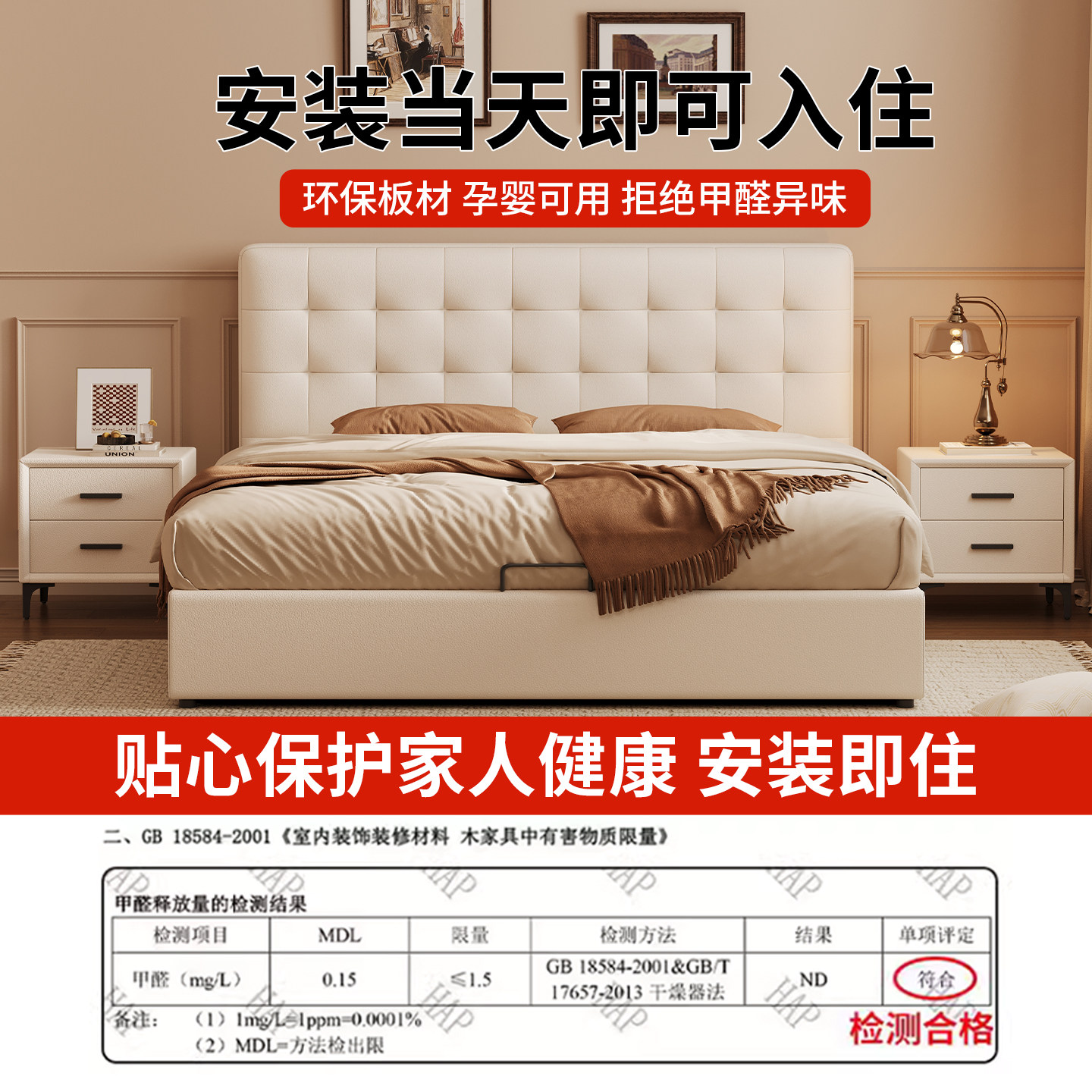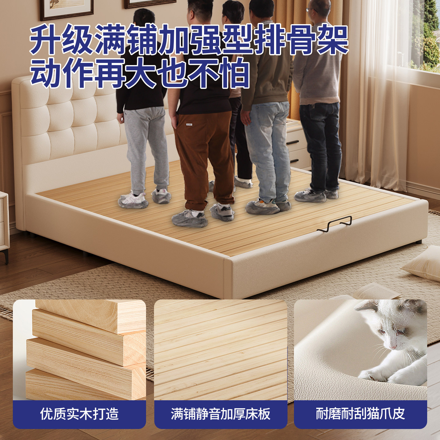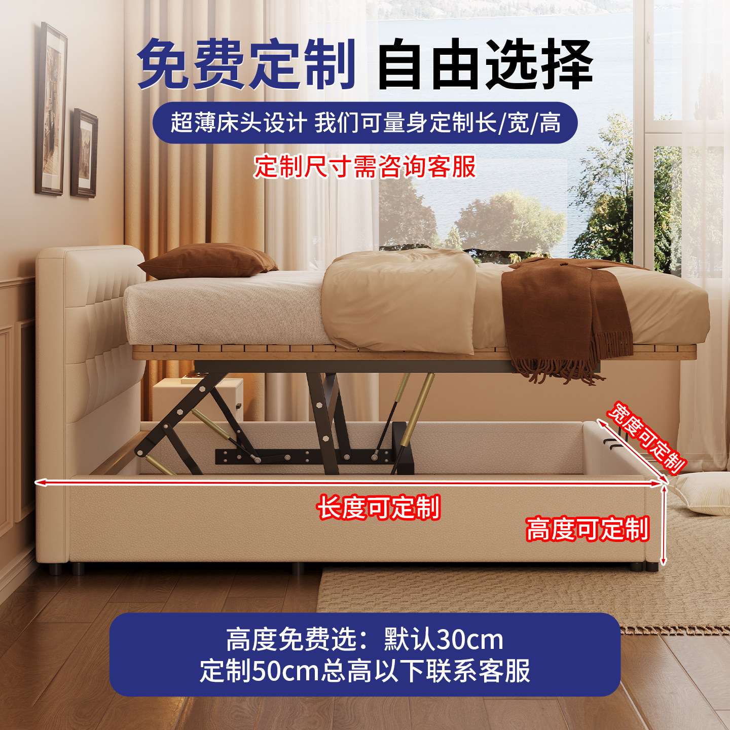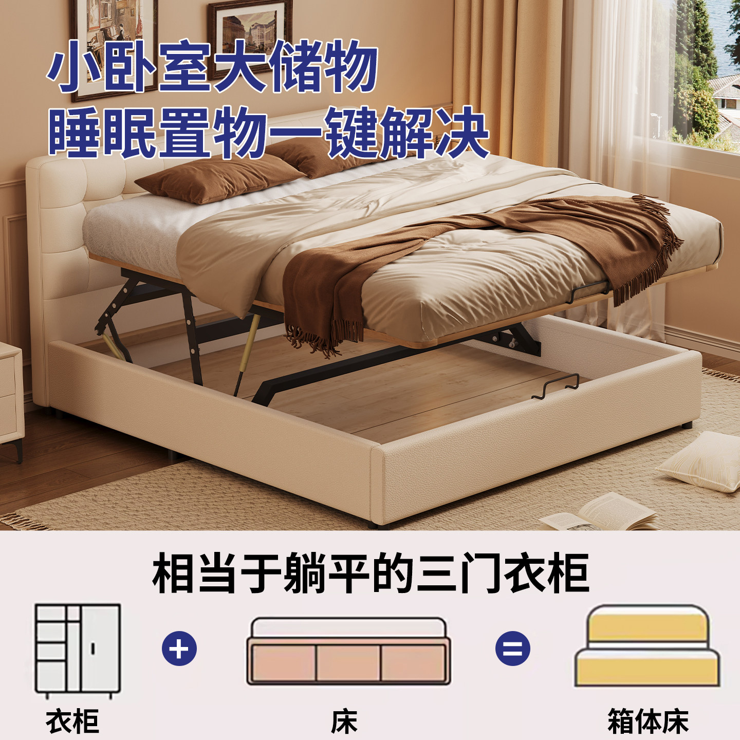 小户型华夫格奶油风薄床头气压储物多功能箱体大容量静音床可定制