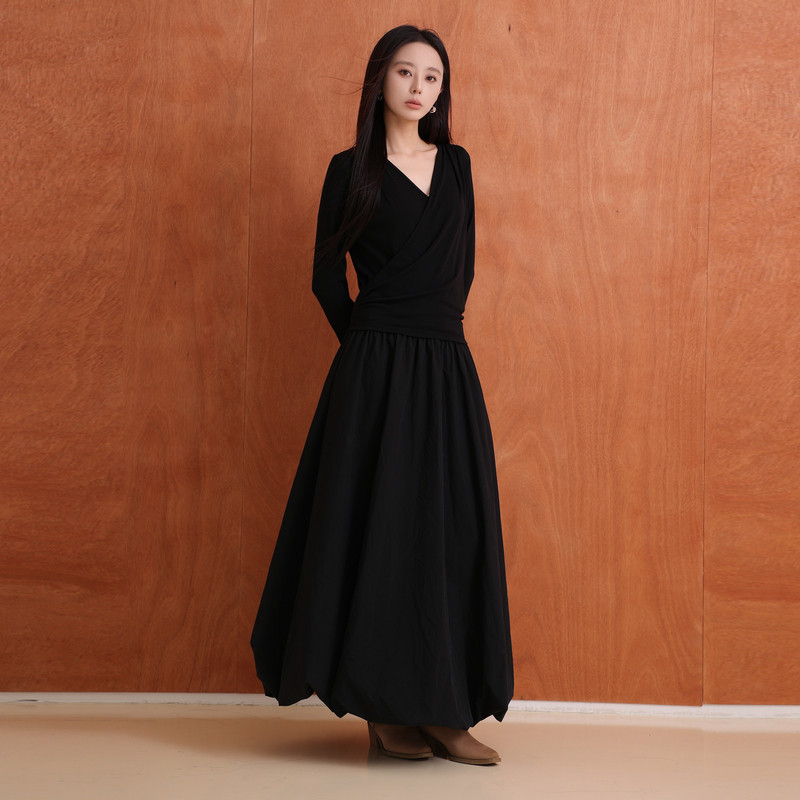 iqcq气球熊时尚辣妹套装秋季抹胸连衣裙女收腰一字肩黑色蓬蓬裙子