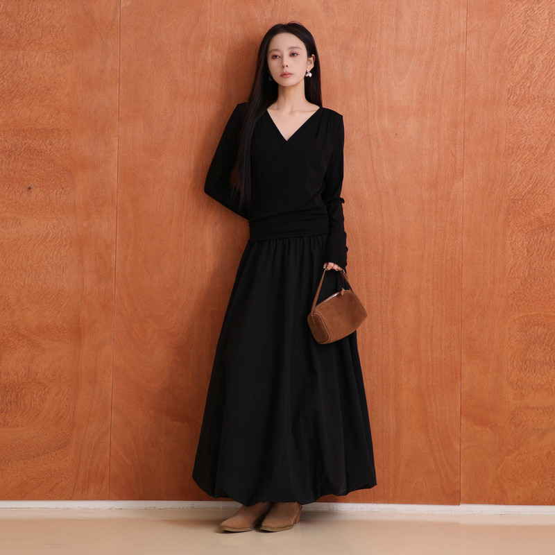 AIRIQI商场同款25秋新款修身显瘦简约堆褶长袖连衣裙女AY53LQ197