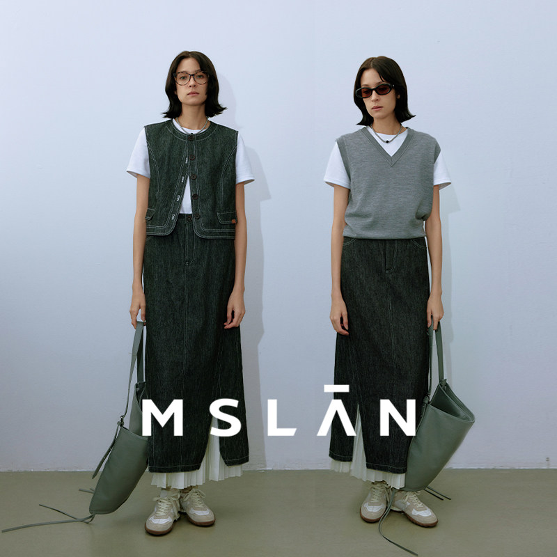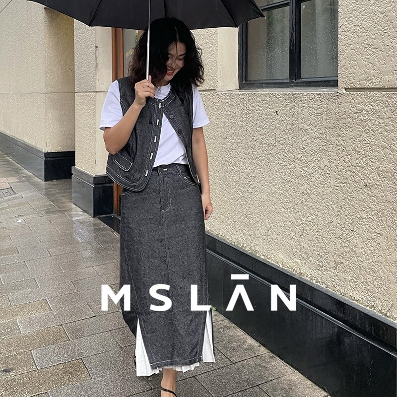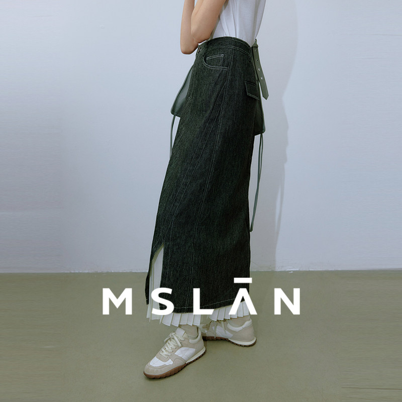 MSLAN复古时尚雪纺拼接中长裙撞色褶皱牛仔棉质半身裙26春