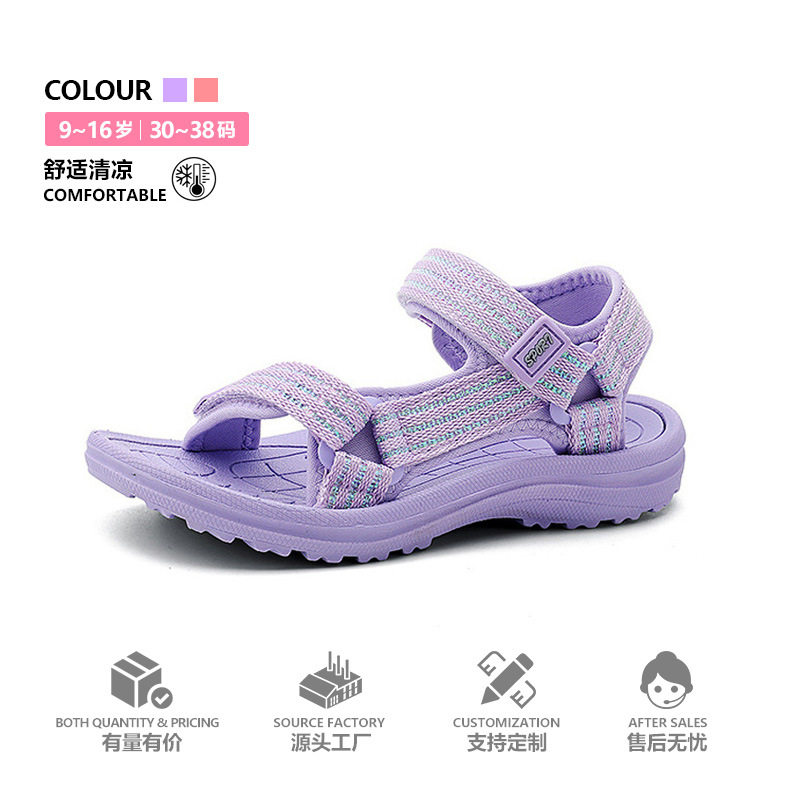 纯色魔术贴儿童沙滩鞋甜美风女孩凉鞋中大童实心软底女童凉鞋